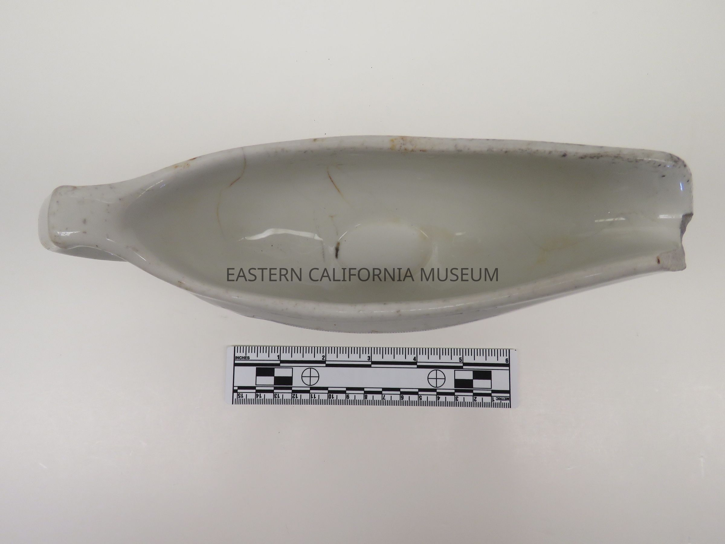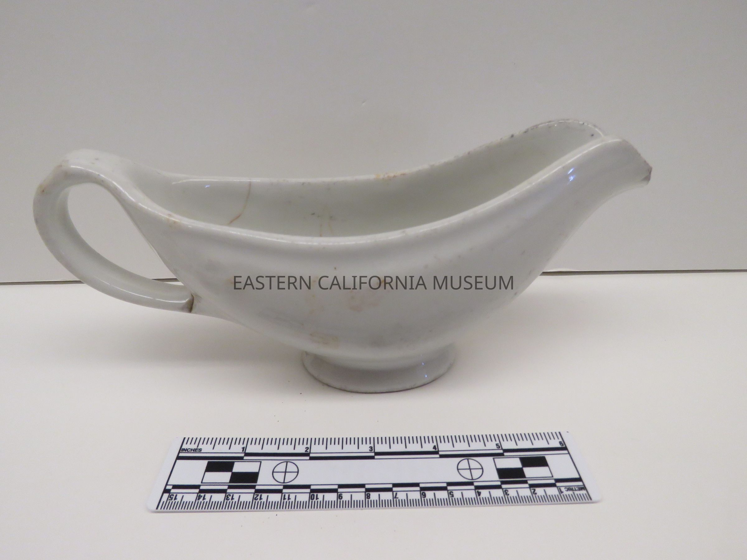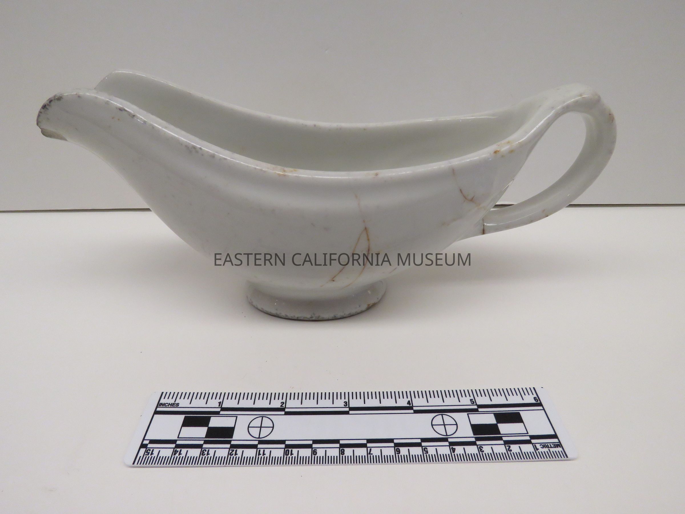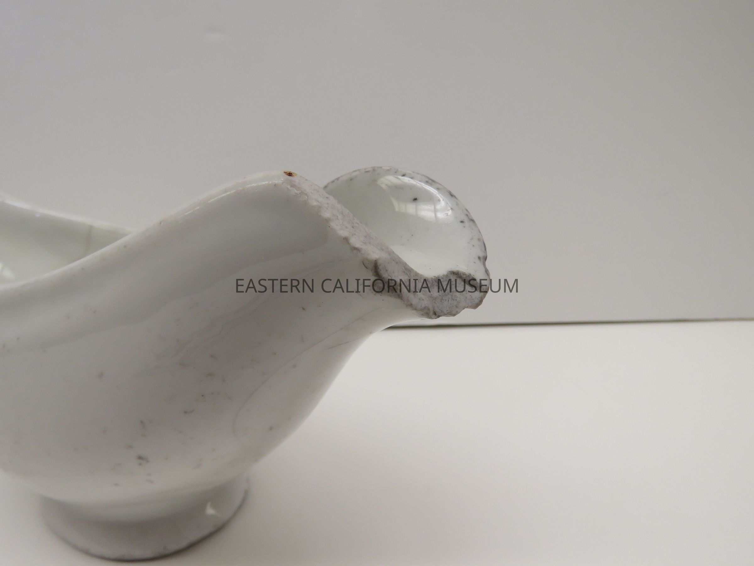 White sauce boat with "U.S.Q.M.C., Shenango, New Castle, PA" stamped on the bottom in blue. The spout is broken off at the tip. It was likely used at Manzanar War Relocation Center.Collection