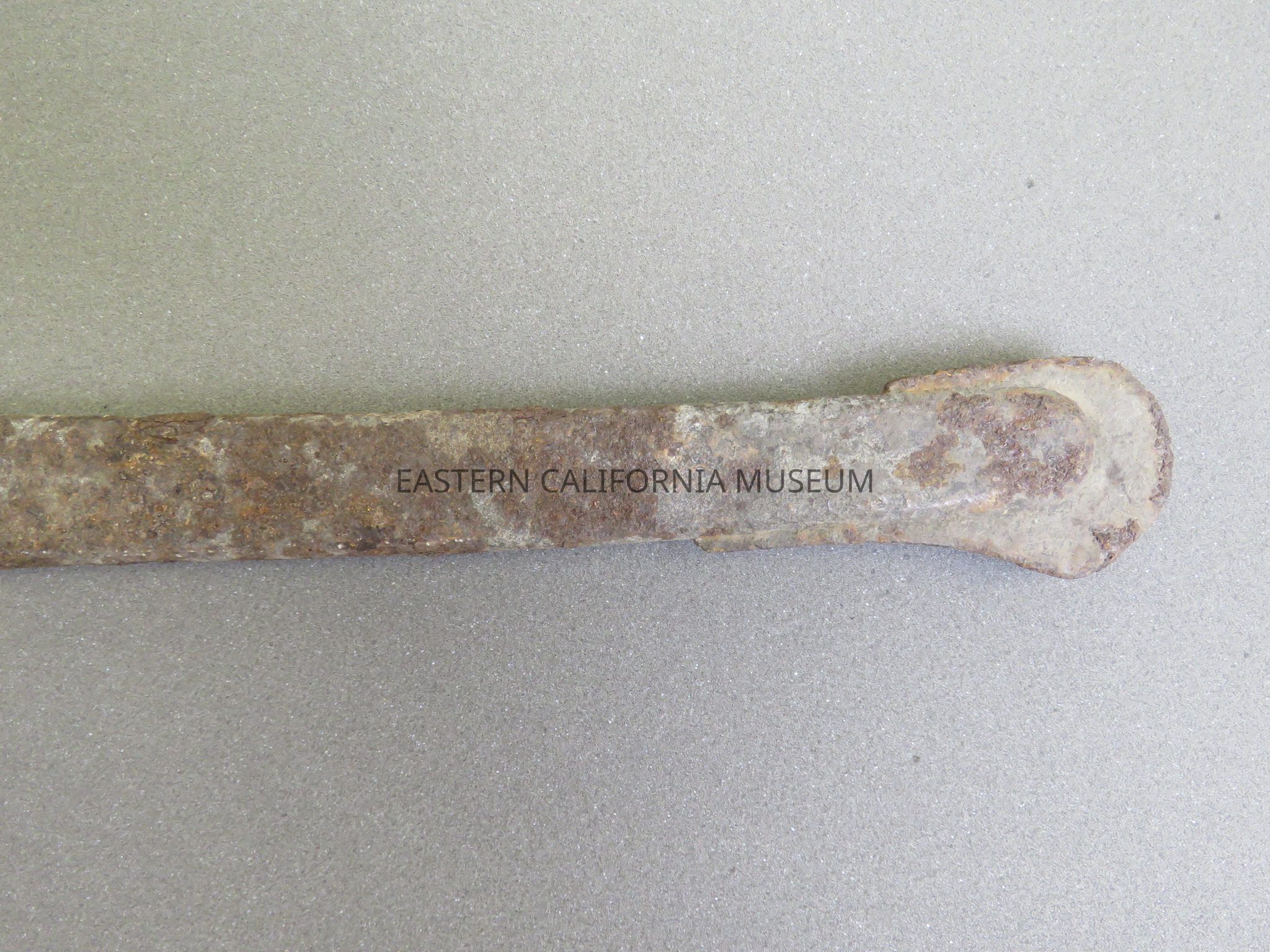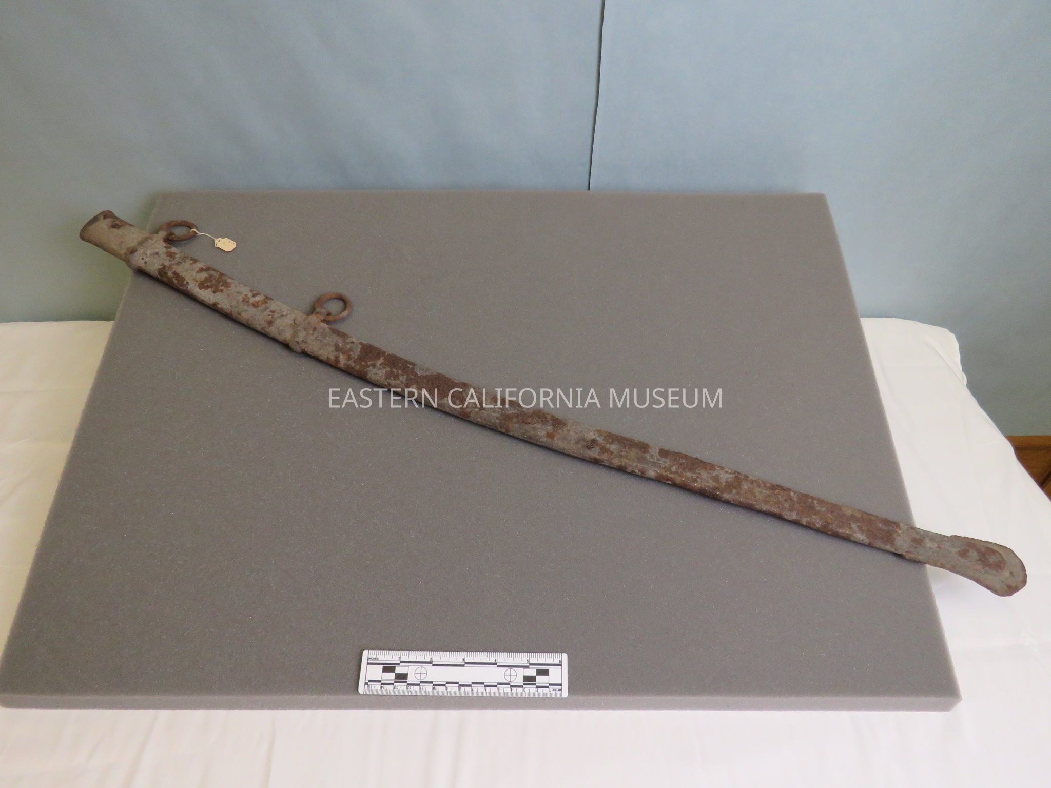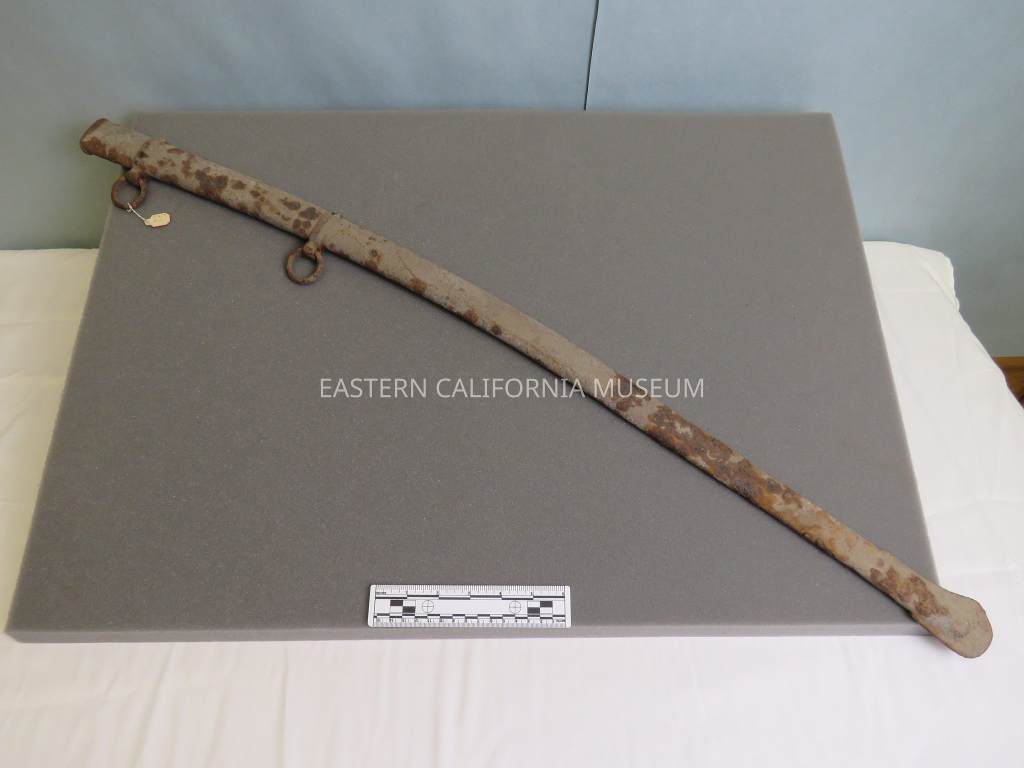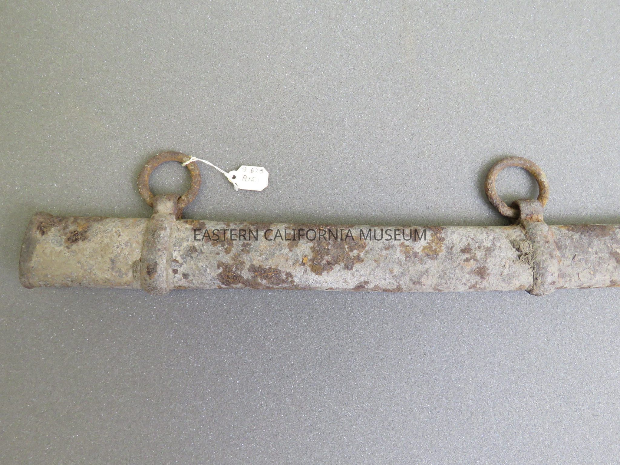Badly rusted metal cavalry saber scabbard found at Zucco Ranch in the Fort Independence area by the Zucco brothers on 06/13/1930. Part of the Zucco Ranch is on land that was formerly part of Camp Independence. The first saloon at the Fort was near the present ranch house.Collection