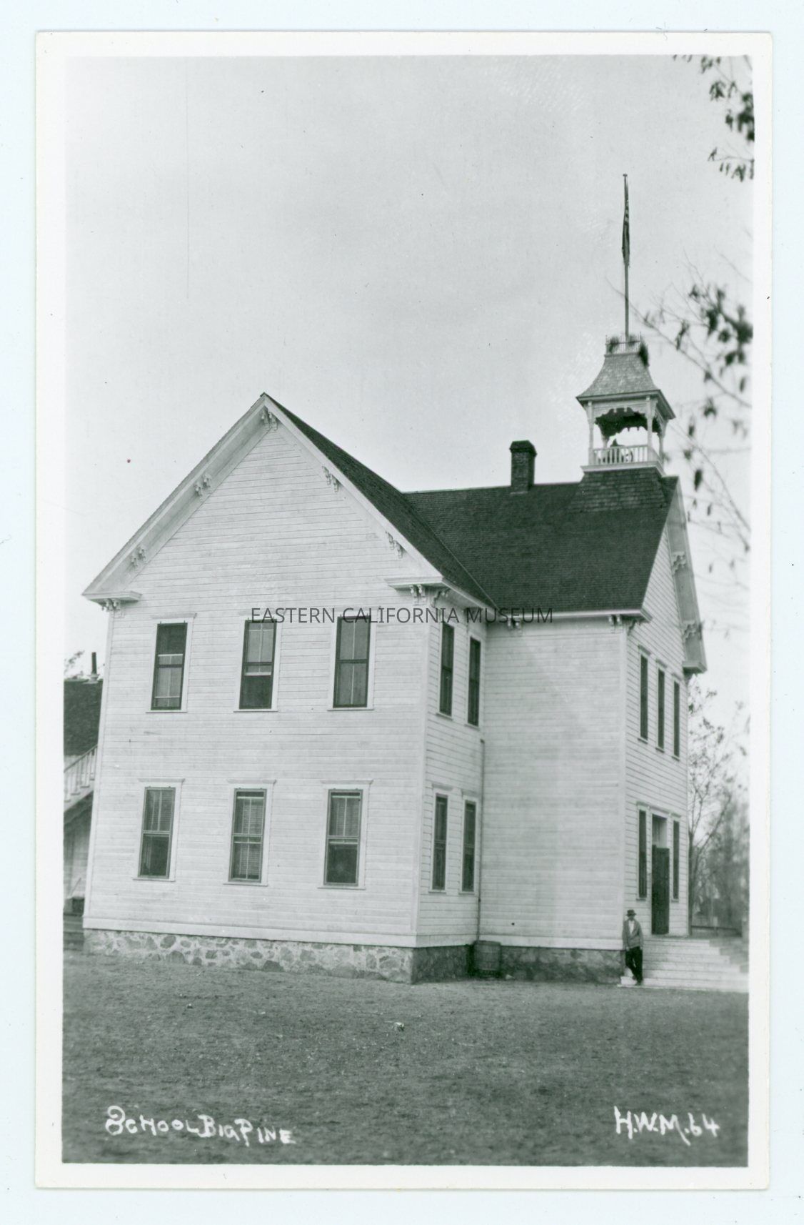 Photo postcard titled, "School, Big Pine" taken by photographer Harry W. Mendenhall and given his ID #64. It shows the two story school house with one man leaning against the wall near the front steps.Photograph Details