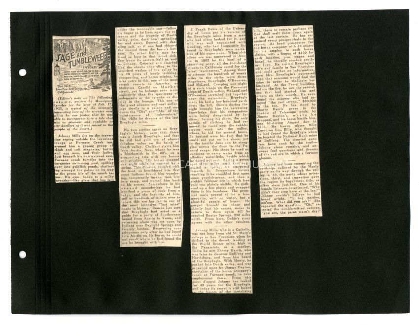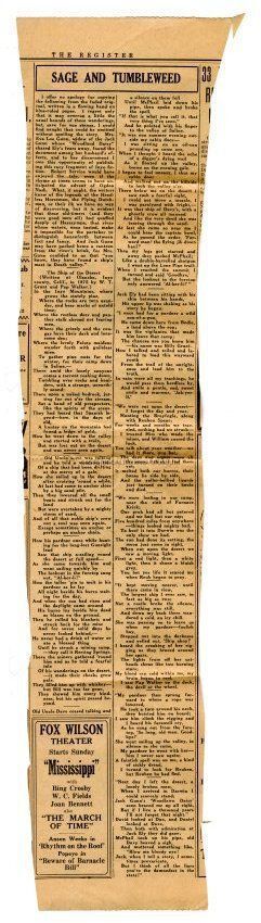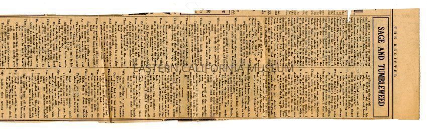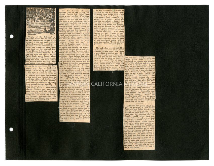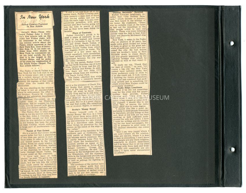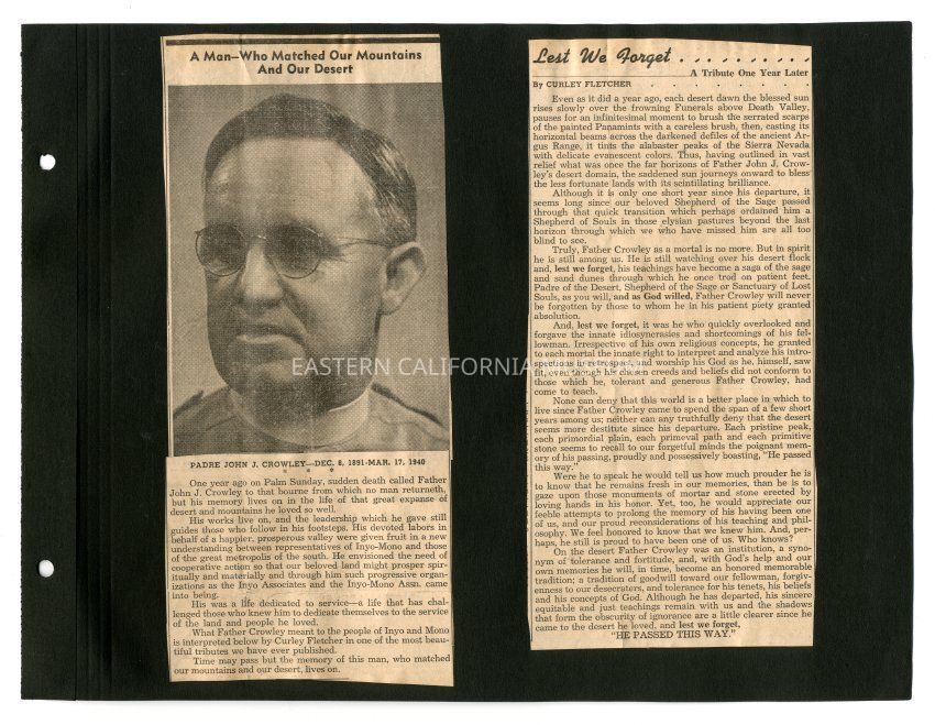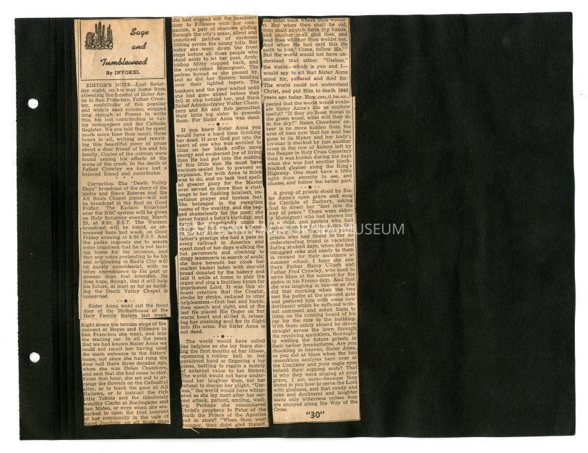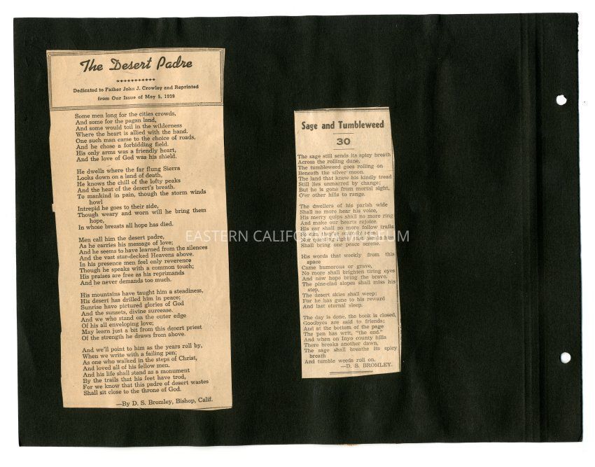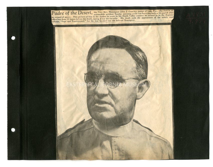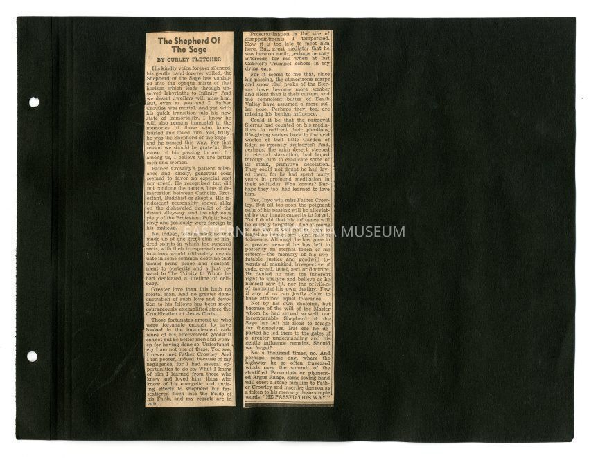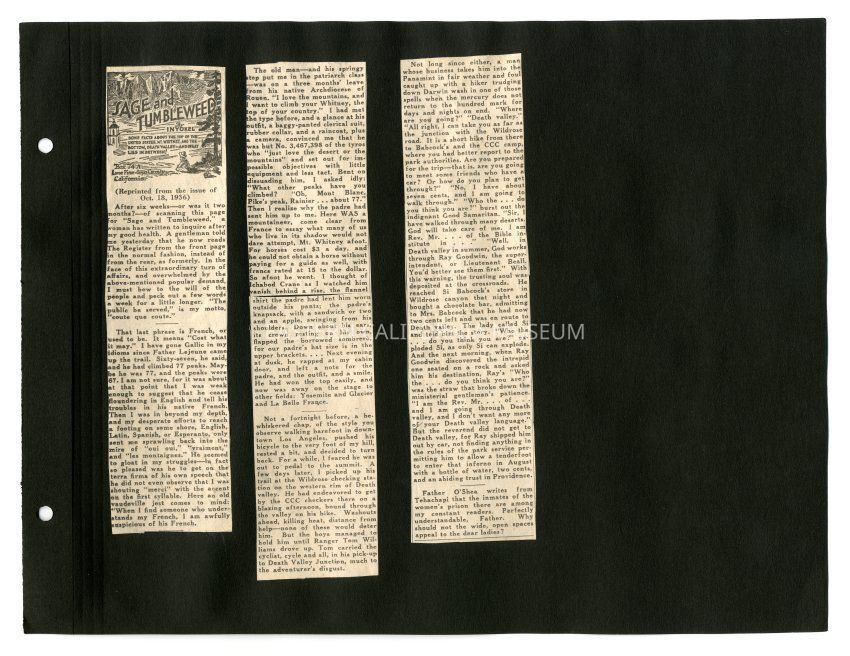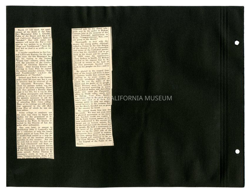Scrapbook of newspaper clippings, primarly copies of "Sage and Tumbleweed," a column written by Father John J. Crowley, and also articles about his death. There are a few loose clipped columns in an envelope tucked inside the scrapbook.Collection