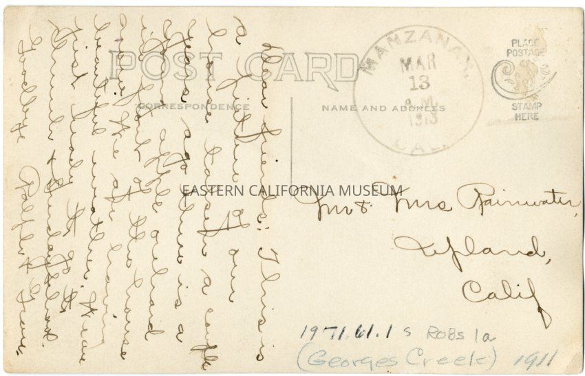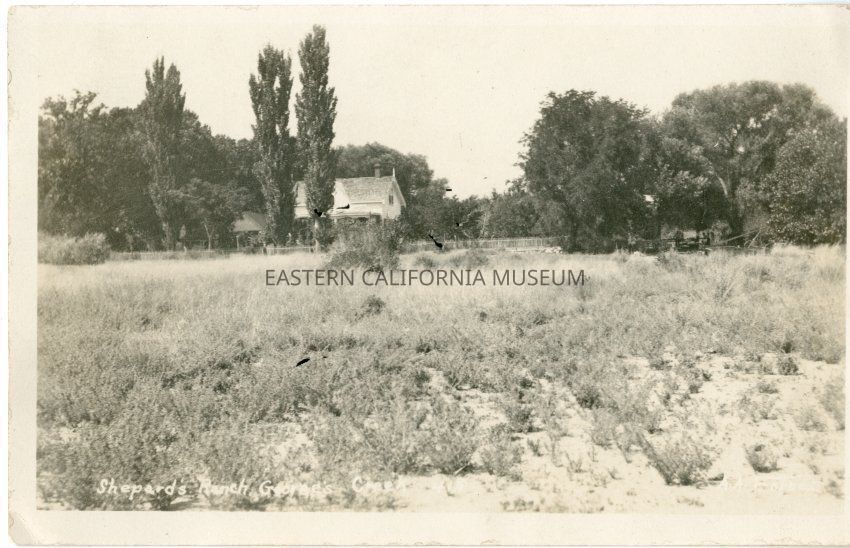 Photo postcard of John Shepherd's ranch and house on George's Creek near Manzanar. It is postmarked March 13, 1913 and was sent to Mr. and Mrs. Rainwater of Upland, CA. In the body of the message it is mentioned the the photo was taken "of our house a couple years ago. There is a young apple orchard in front of the house now [as of 1913]." The senders' names are hard to read, but they are likely Ralph and Grace Robson.