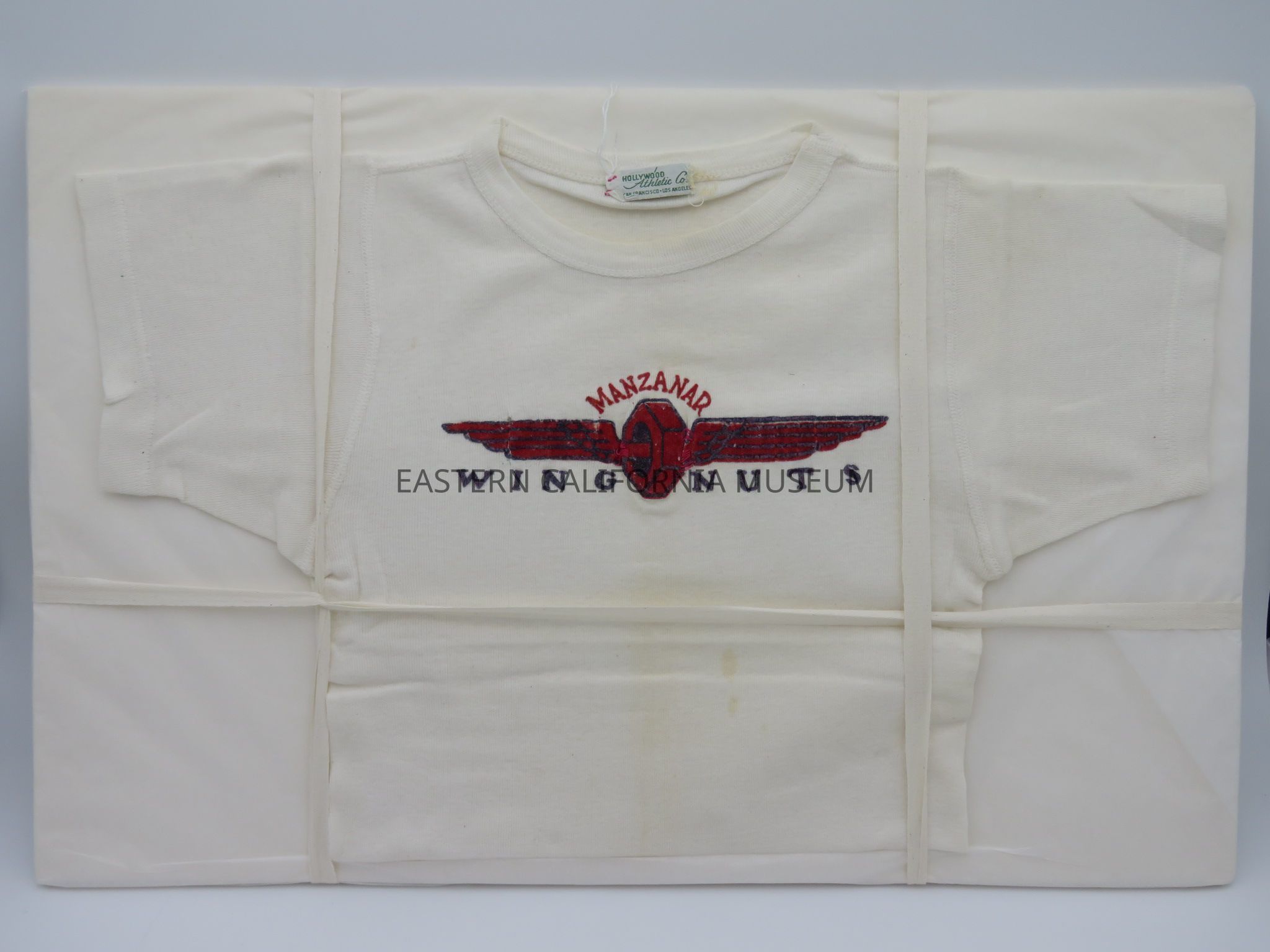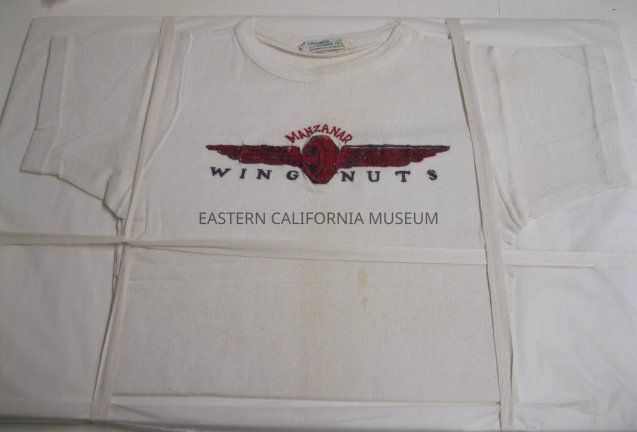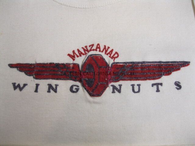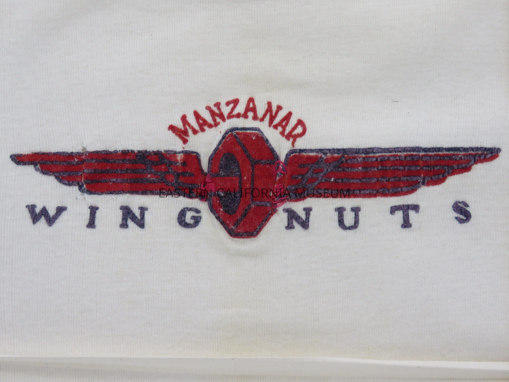 White T-shirt with the Manzanar Wingnuts patch on the front center. The patch consists of a nut with wings in red. Above the patch is "Manzanar" and below the outstretched wings is "Wing Nuts." It was a gasoline model airplane club at Manzanar War Relocation Center.