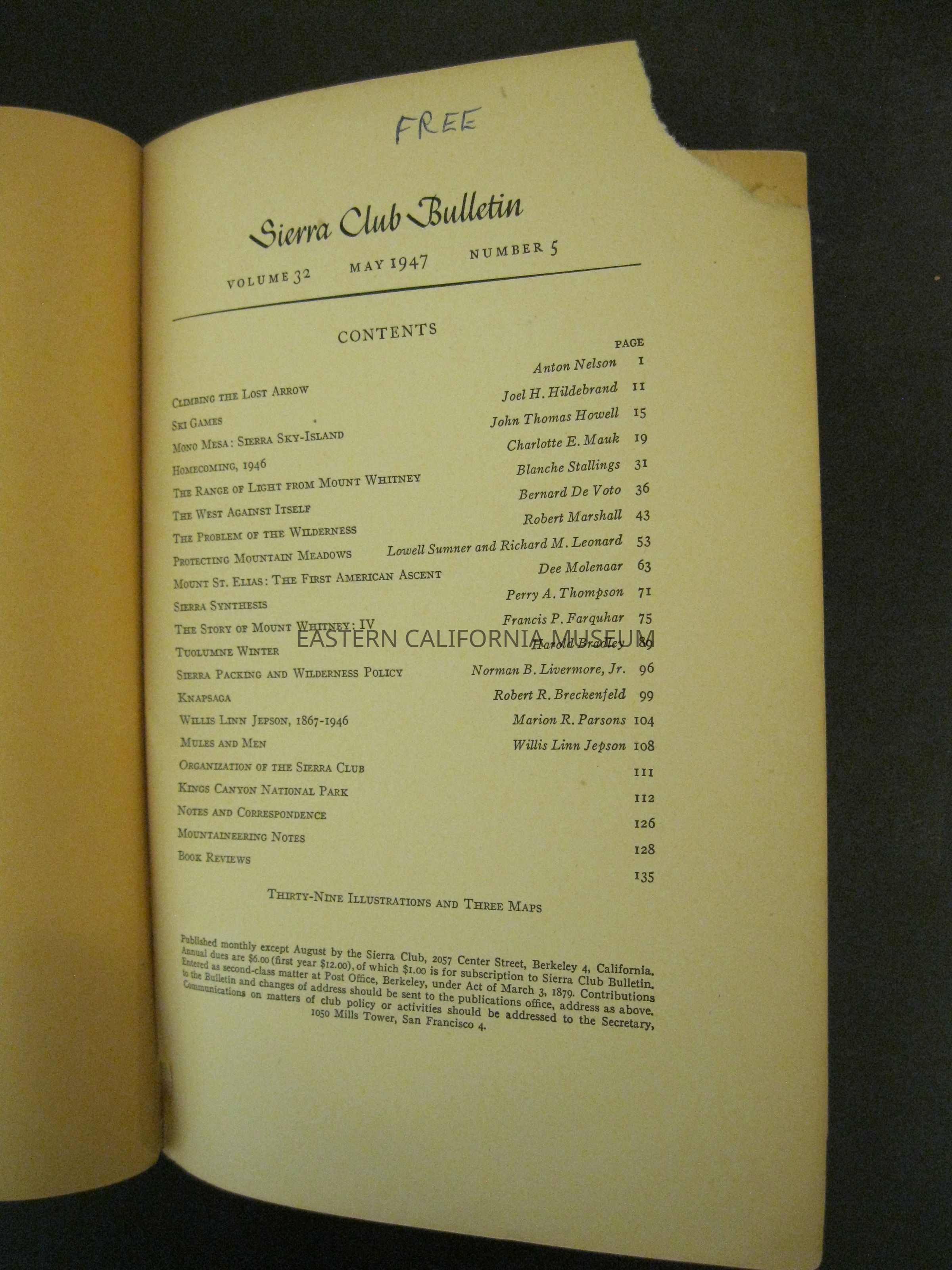 "Sierra Club Bulletin, Vol. 32, No. 5, May 1947" has a tear in the upper right front cover.Publication Details