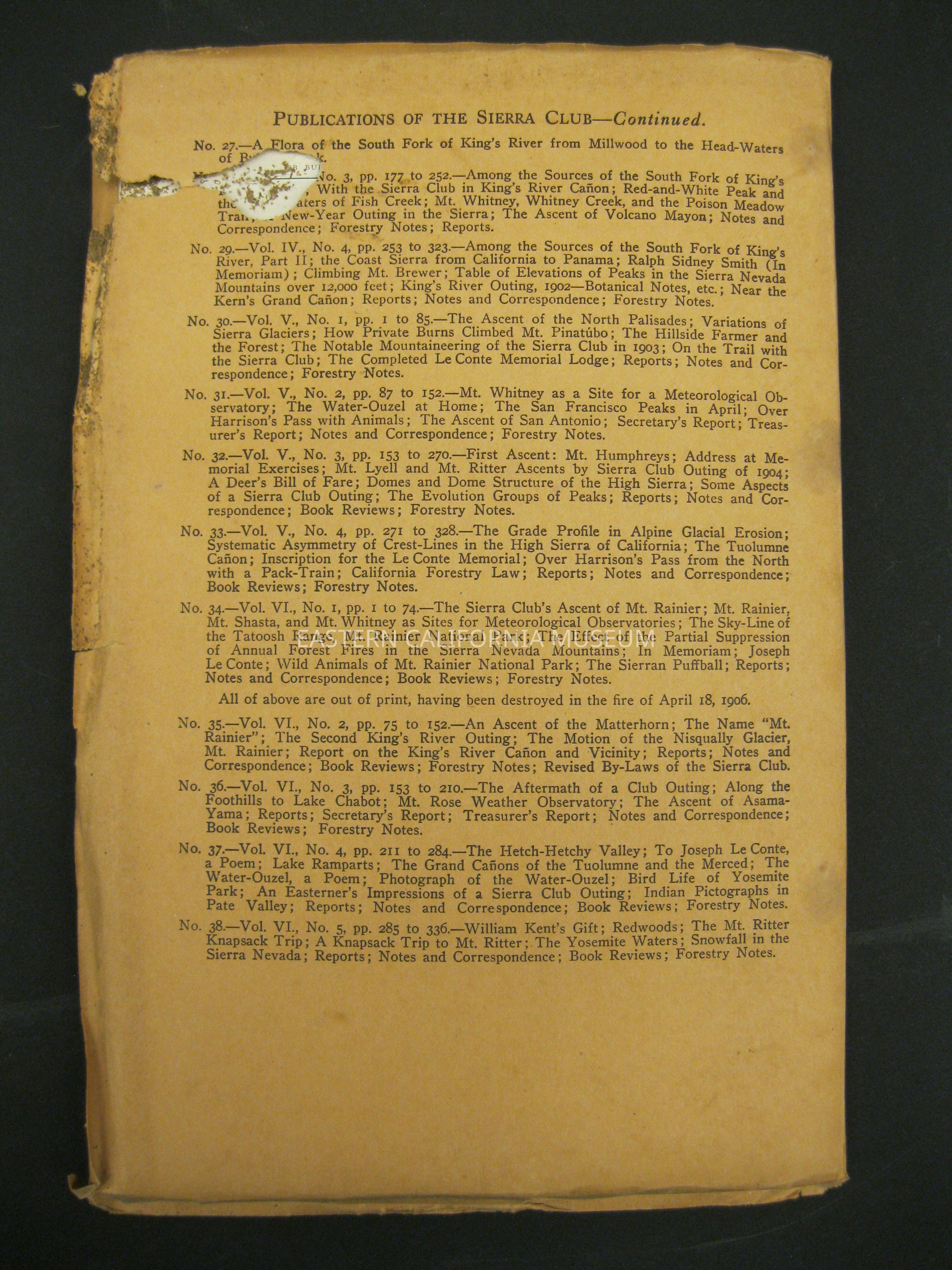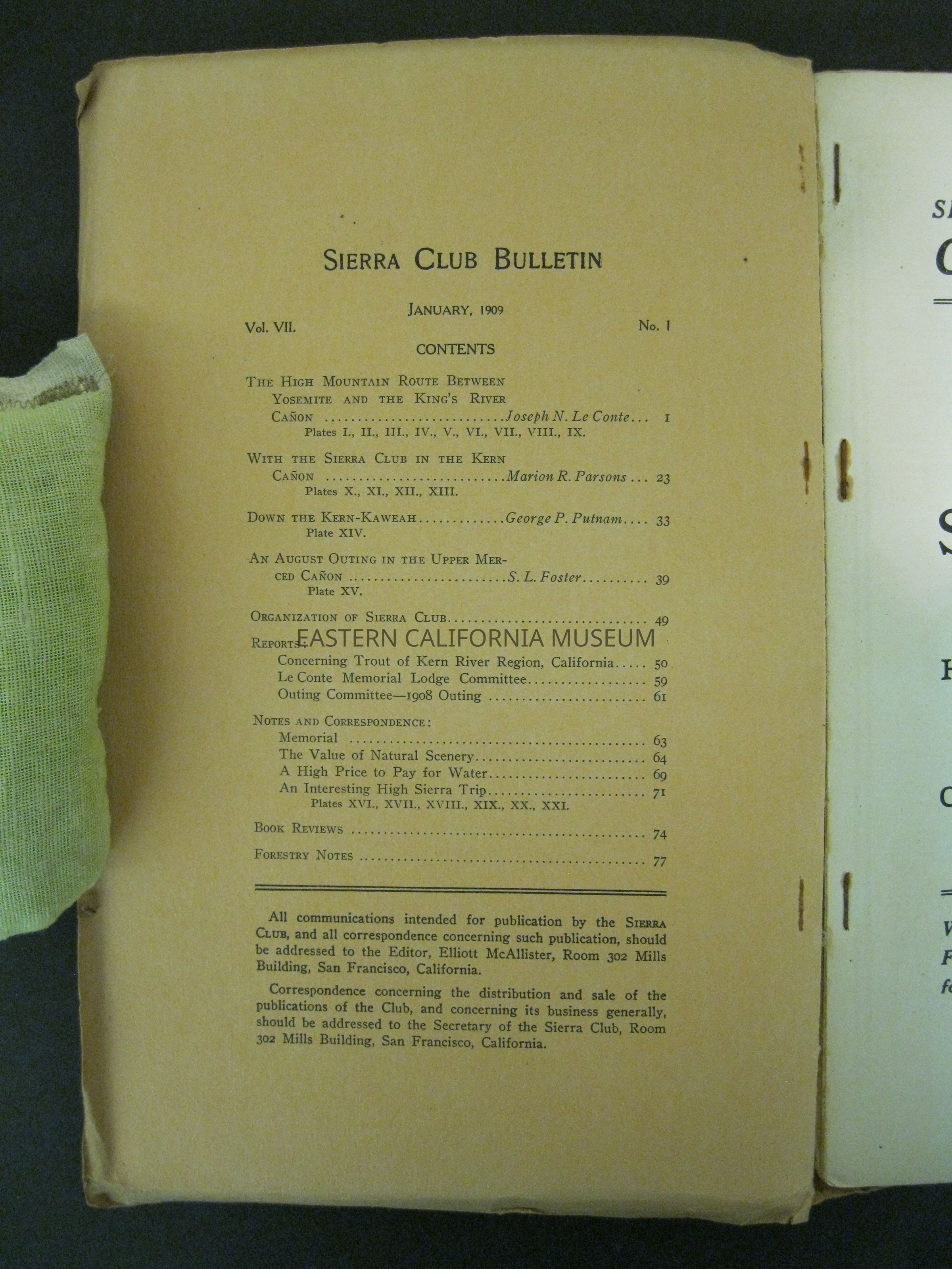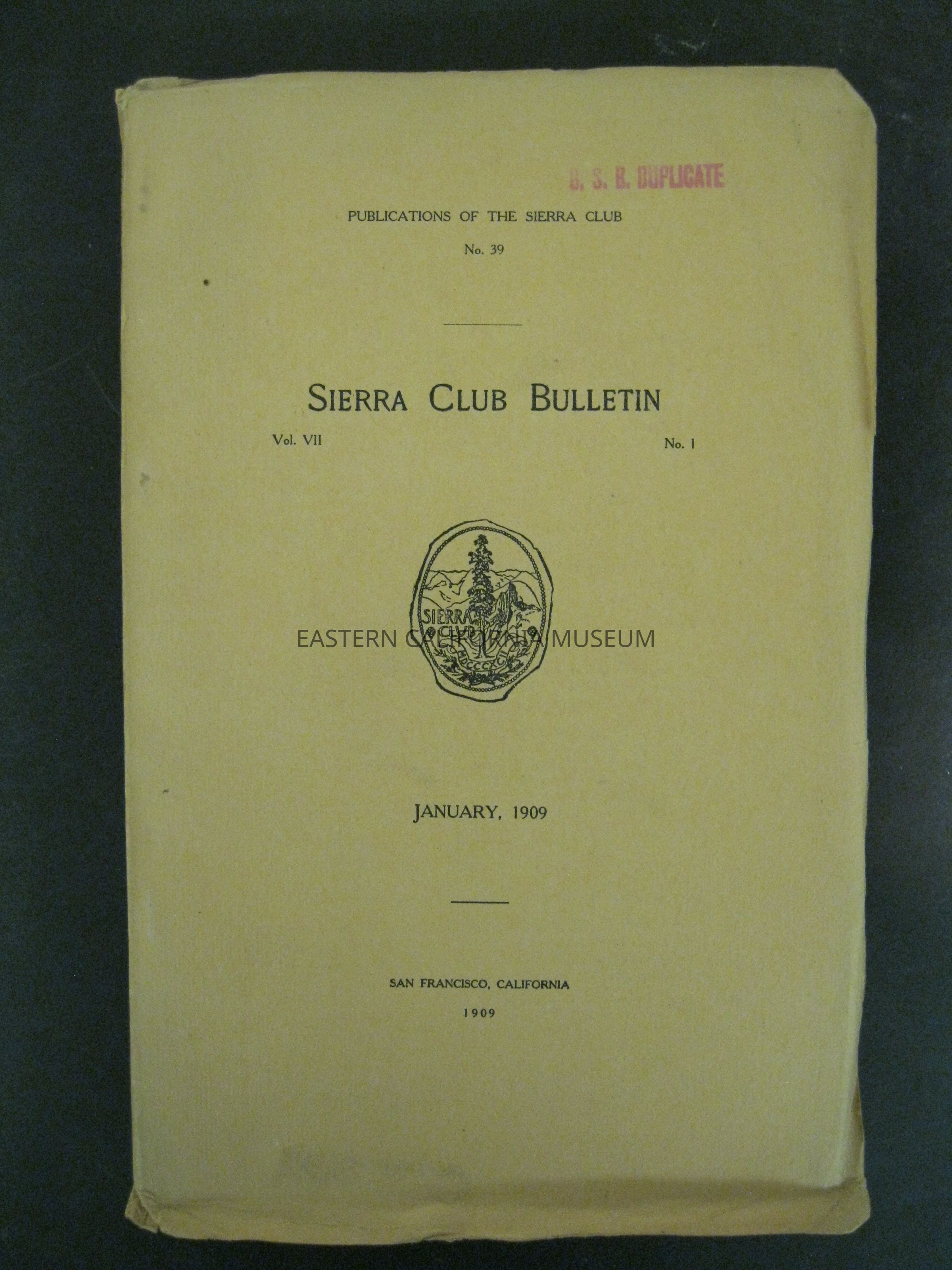 "Sierra Club Bulletin, Vol. VII, No. 1, January 1909" has "G.S.B. Duplicate" stamped in red on the front cover. There appears to be bug damage from page 69 to back cover.Publication Details