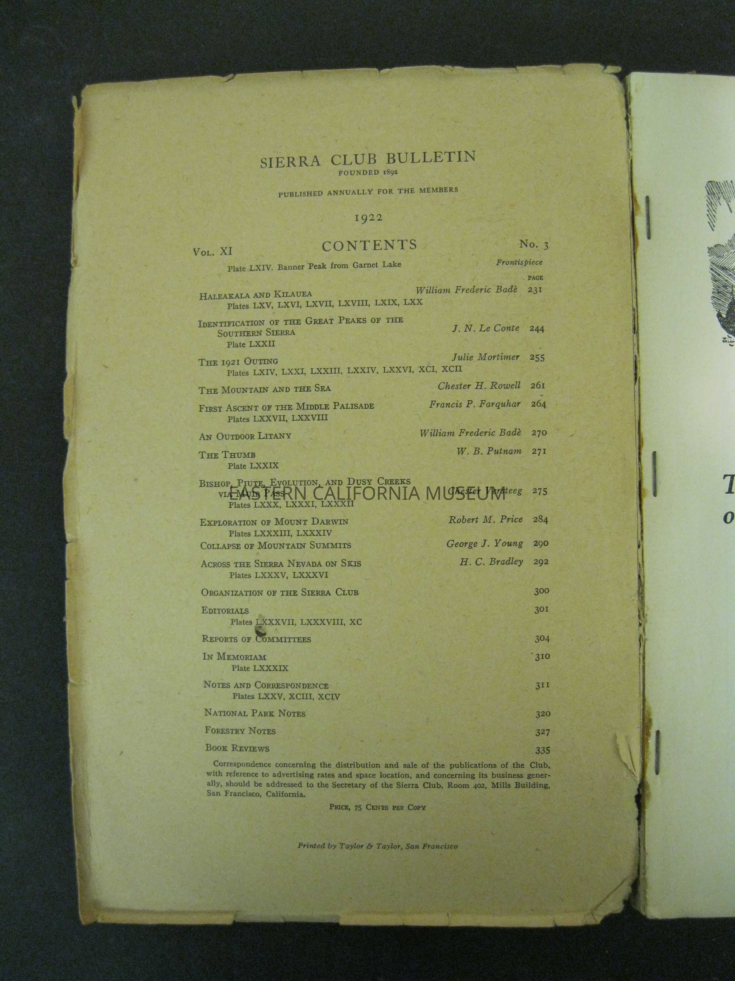 "Sierra Club Bulletin, Vol. XI, No. 3, 1922" has a detached back cover.Publication Details