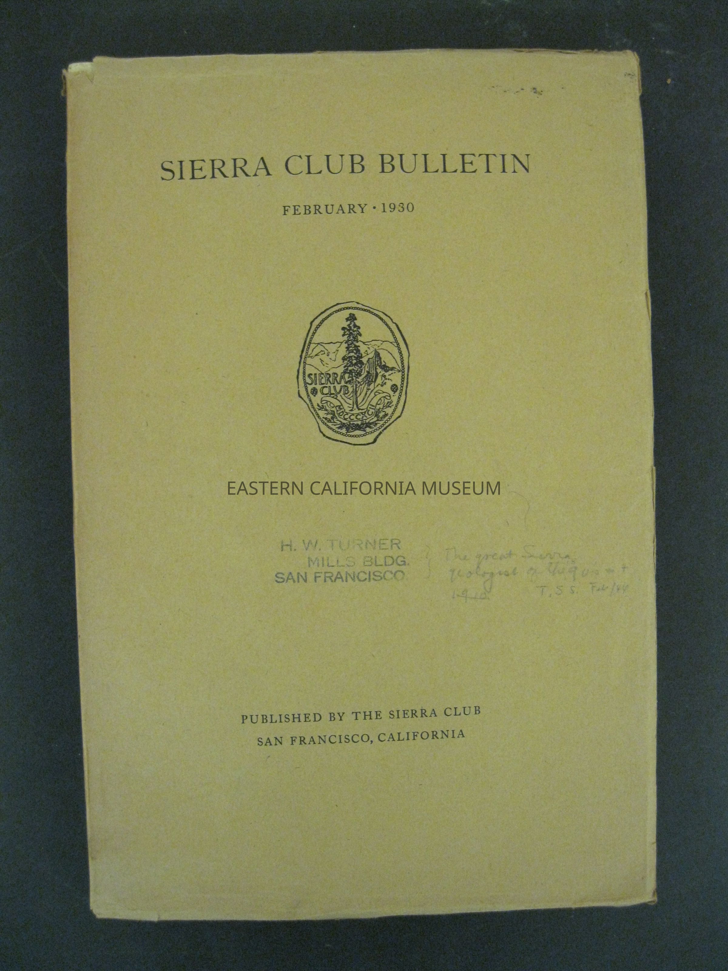 "Sierra Club Bulletin, Vol. XV, No. 1, February 1930" has "H. W. Turner" stamped on the front cover.Publication Details