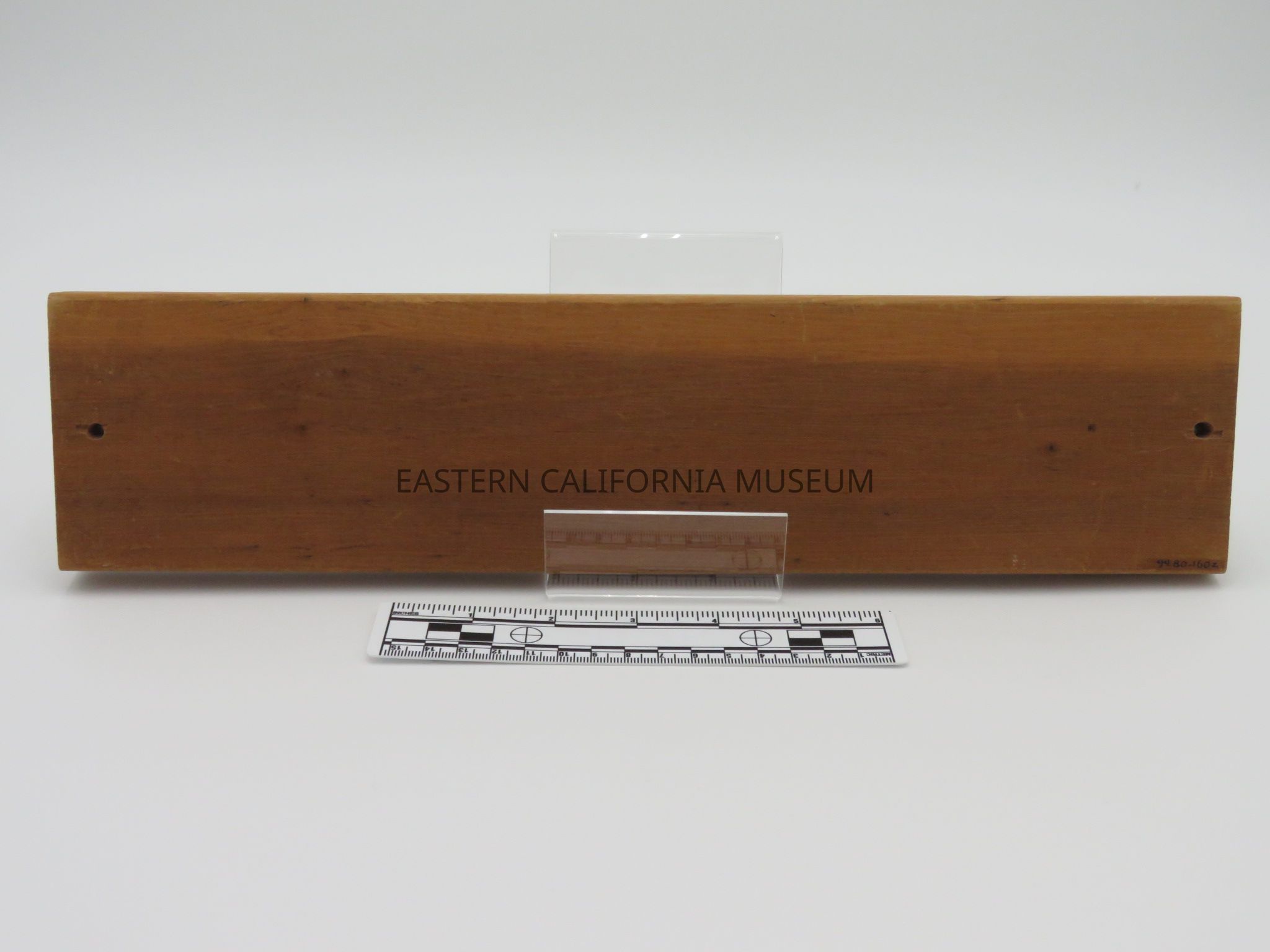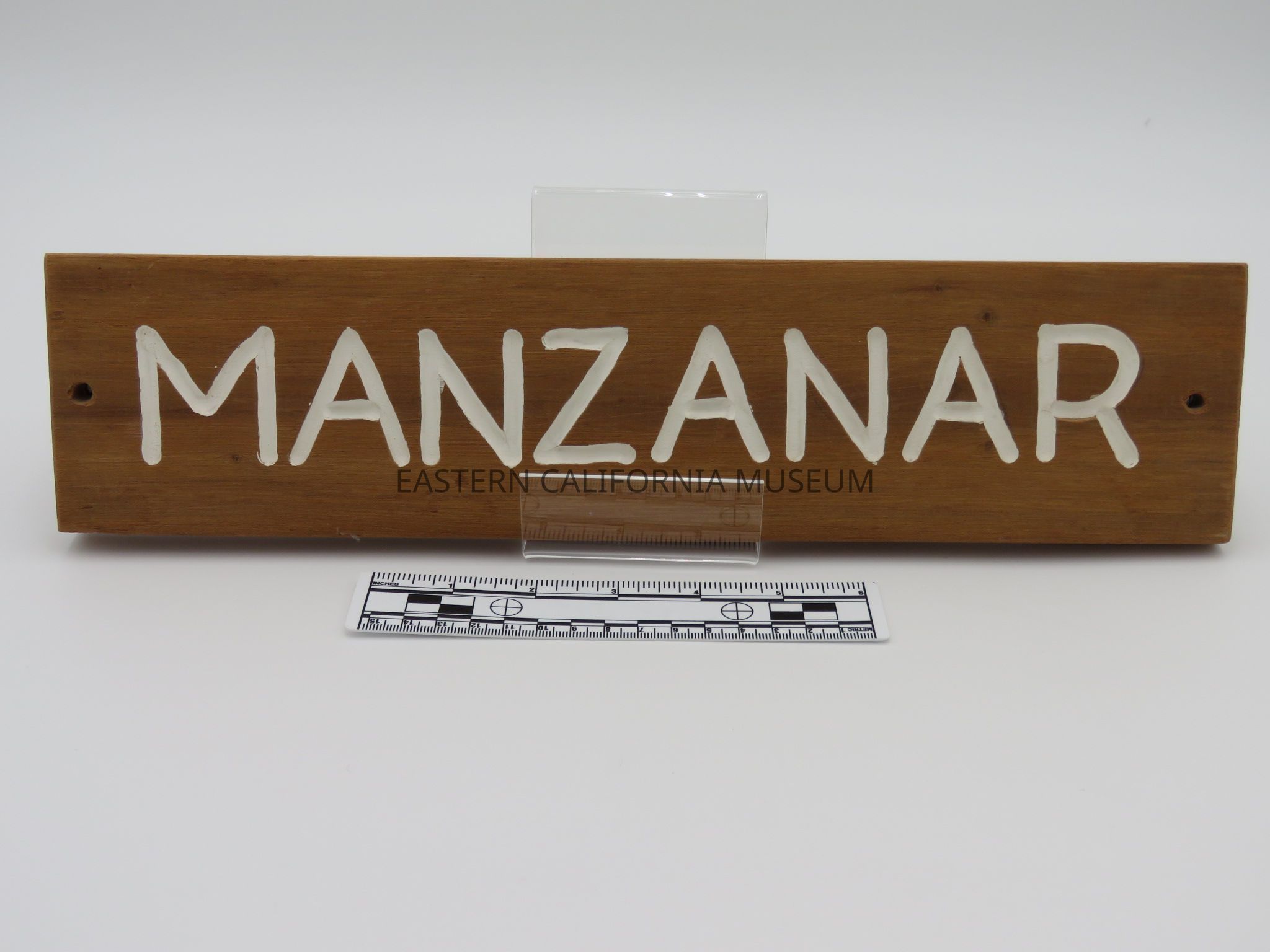Wood sign that has "Manzanar" routered in it and the letters painted white. There are two screw holes on the left and right sides.