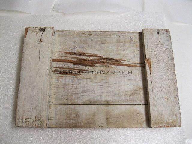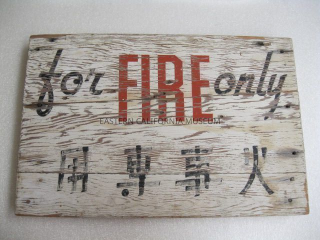 Wood sign from Manzanar War Relocation Center that says, "for fire only" in English and likely also in Japanese. The word "FIRE" is red and the rest of the lettering is black on a white background.Collection