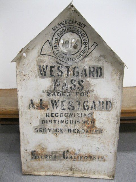 Large white sign shaped like a house with roof overhang. Black lettering says, "See America First / Inyo Good Road Club / El Camino Sierra / Westgard Pass / Named for A. L. Westgard / Recognizing Distinguished Service Rendered / Sierra California." Has a circular logo of a curling horn or trumpet encircling the date 1916.