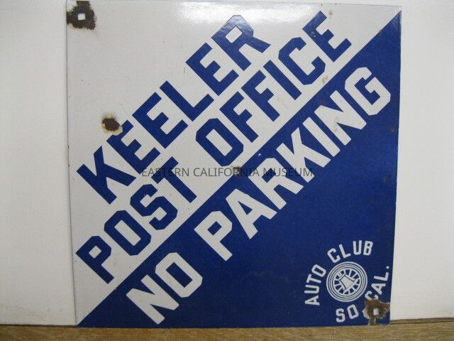 Diamond shaped Automobile Club of Southern California road sign, white and blue, that says, "Keeler Post Office / No Parking."