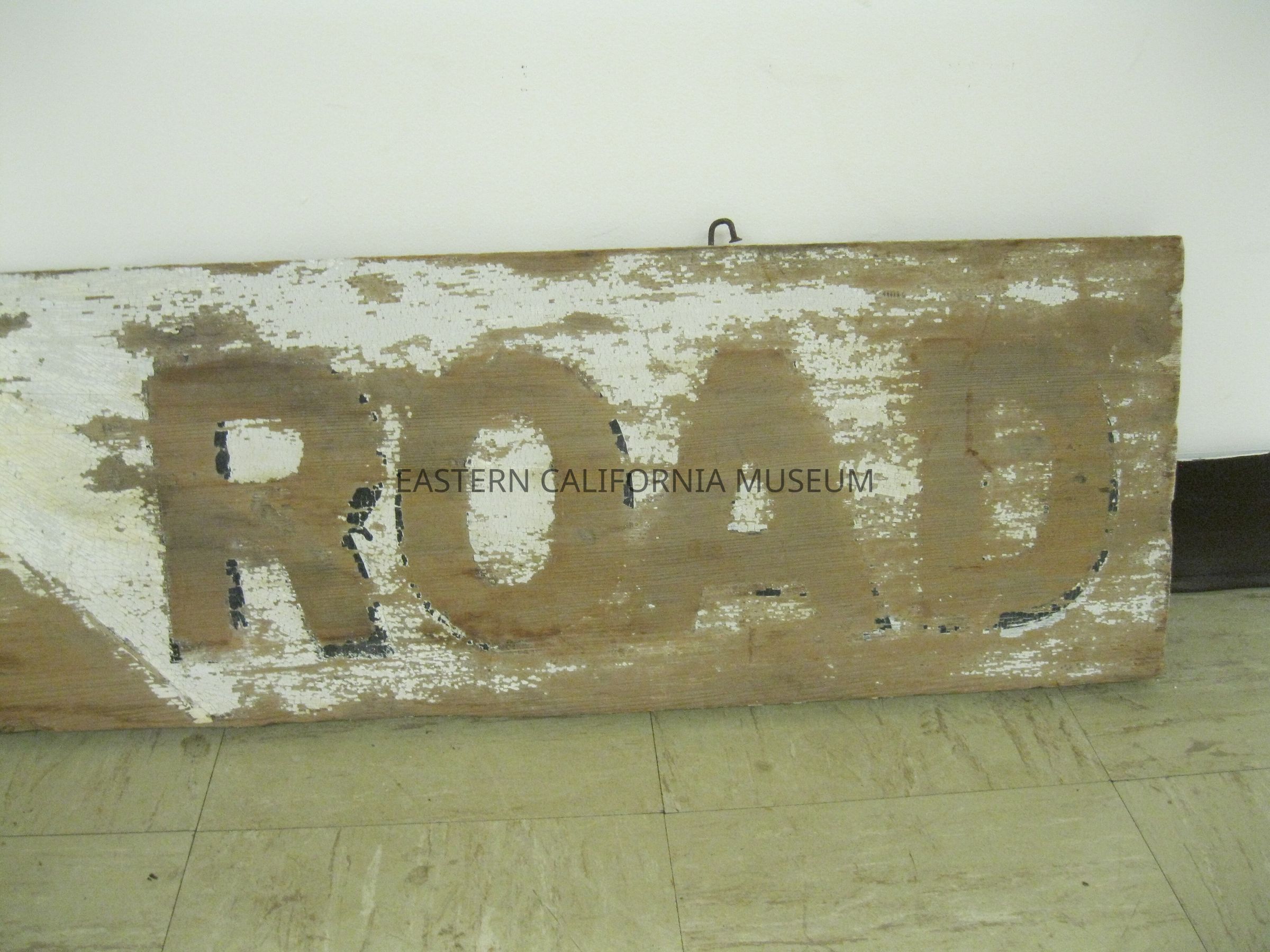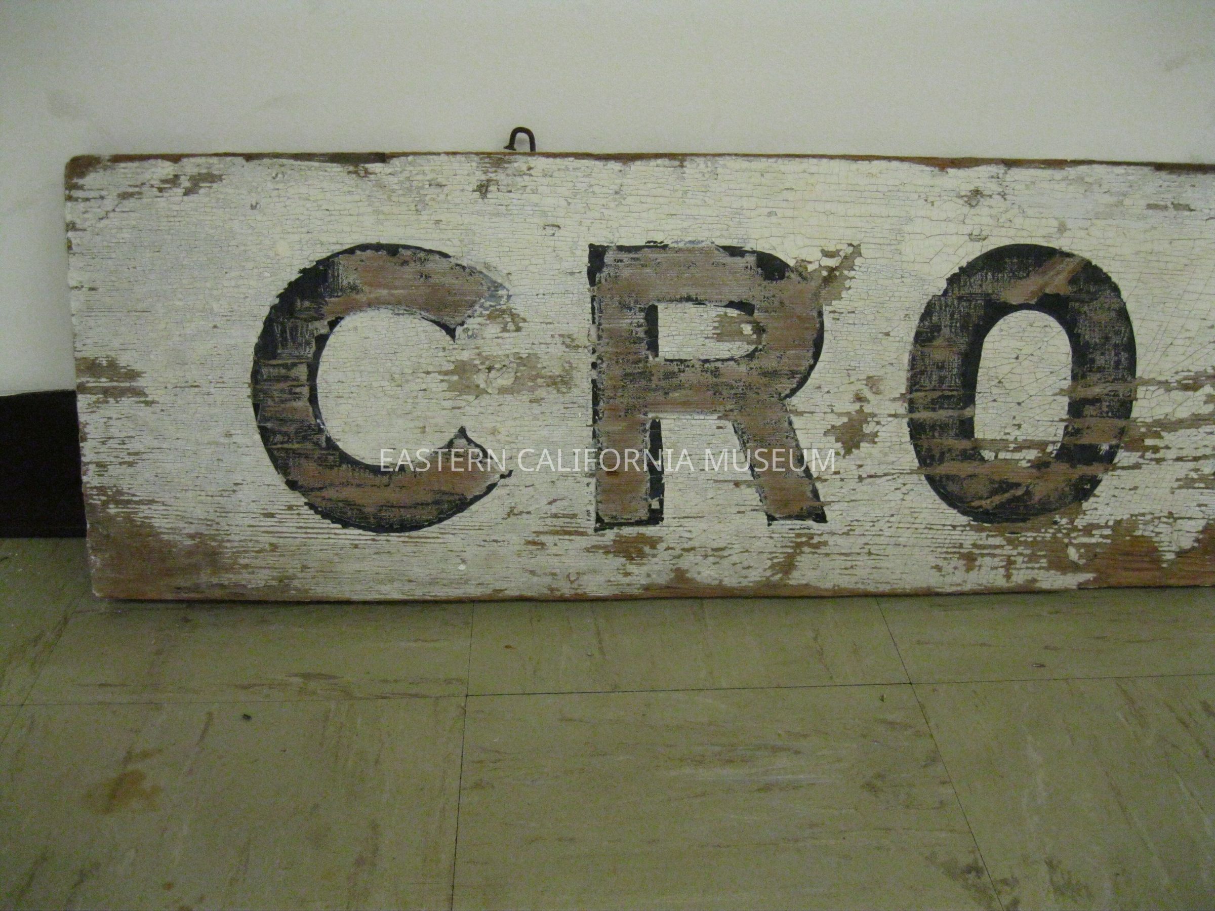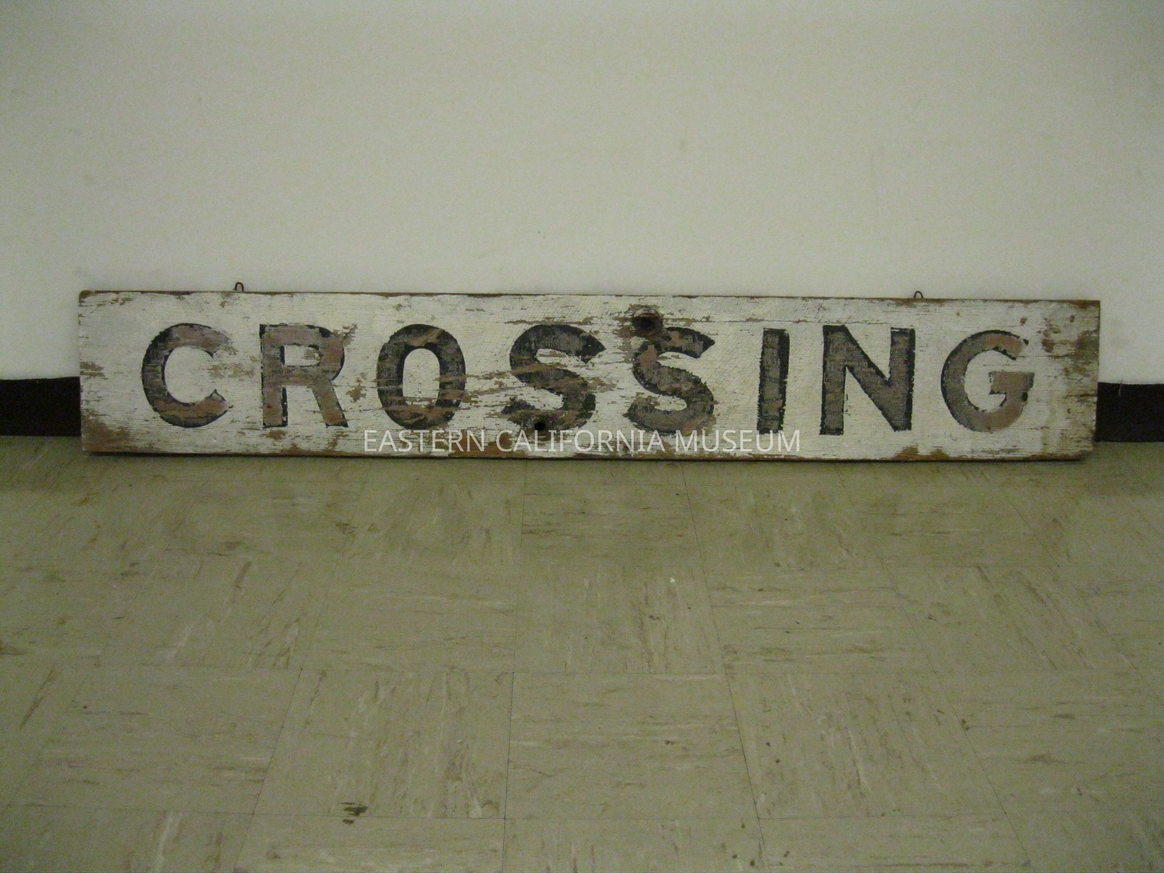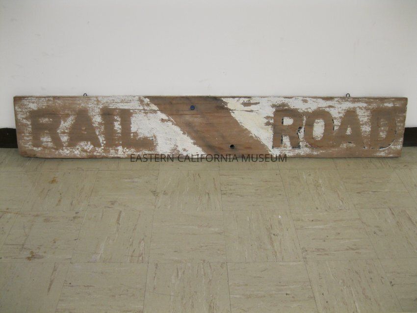 Weathered sign that says "Rail Road" on one side and "Crossing" on the other. Black letters on a white background. Two holes for mounting in the center. Paint lines suggest that this sign was displayed with another sign in an "X" formation.