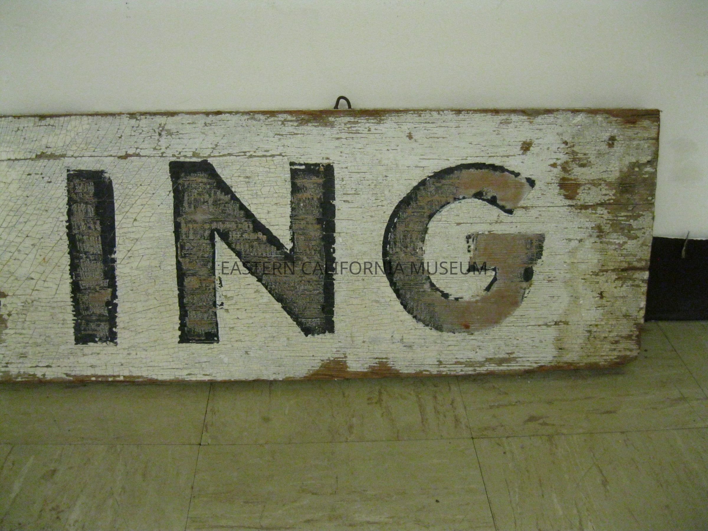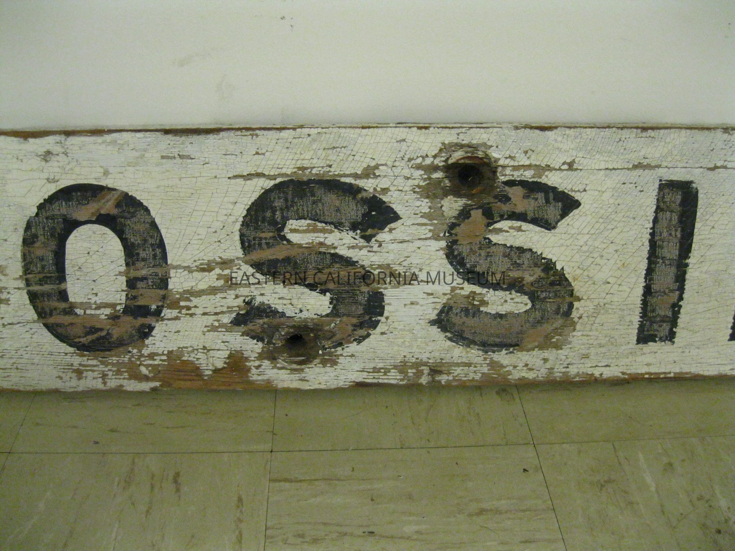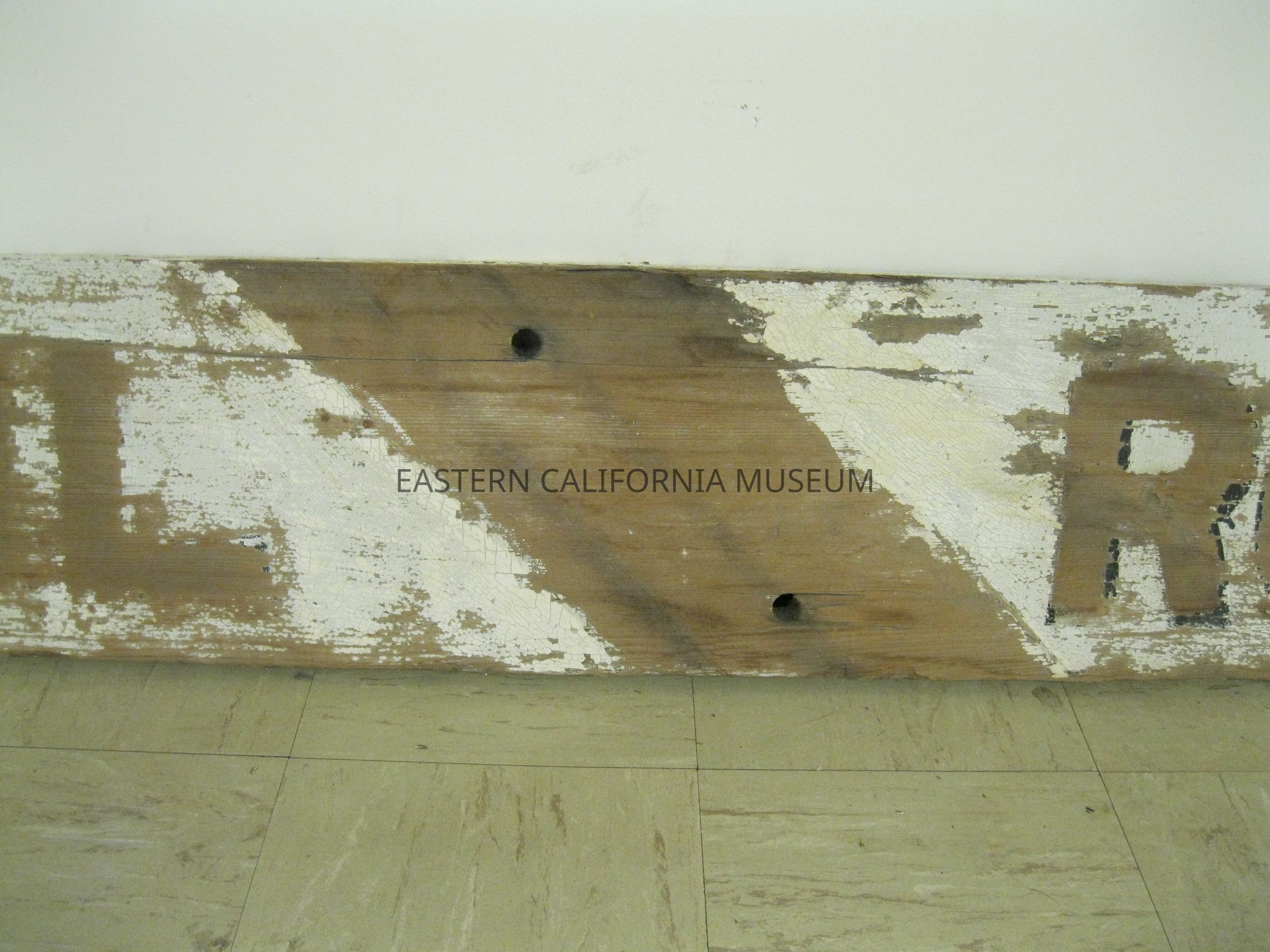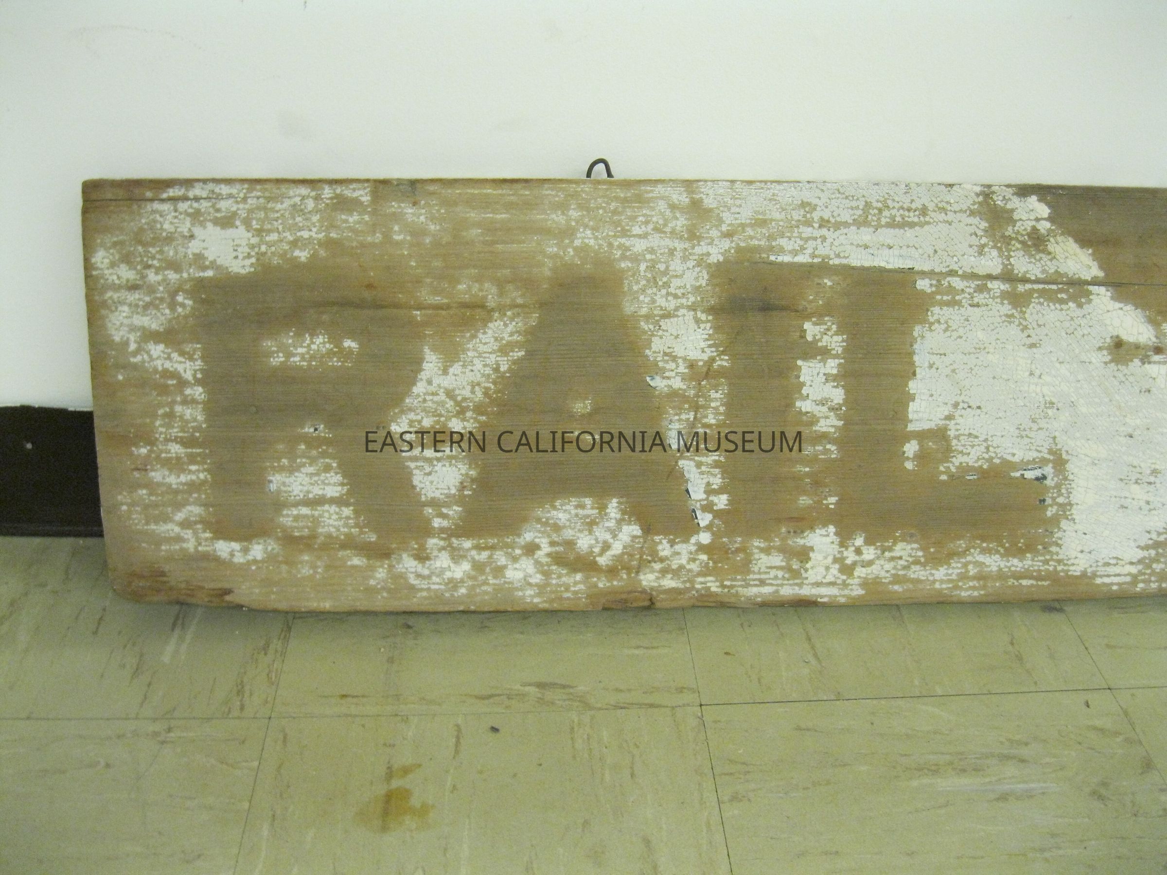 Weathered sign that says "Rail Road" on one side and "Crossing" on the other. Black letters on a white background. Two holes for mounting in the center. Paint lines suggest that this sign was displayed with another sign in an "X" formation.