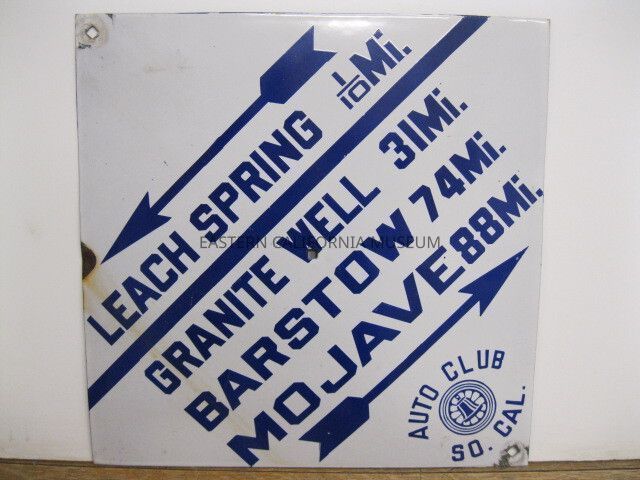 Diamond shaped Automobile Club of Southern California road sign, white with blue lettering, that says, "Leach Spring 1/10 Mi. / Granite Well 31 Mi. / Barstow 74 Mi. / Mojave 88 Mi." There is a small patch of rust near "Leach Spring."Collection