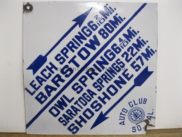 Diamond shaped Automobile Club of Southern California road sign, white with blue lettering, that says, "Leach Spring 6 2/10 Mi. / Barstow 80 Mi. / Owl Spring 6 4/10 Mi. / Saratoga Springs 22 Mi. / Shoshone 57 Mi."Collection