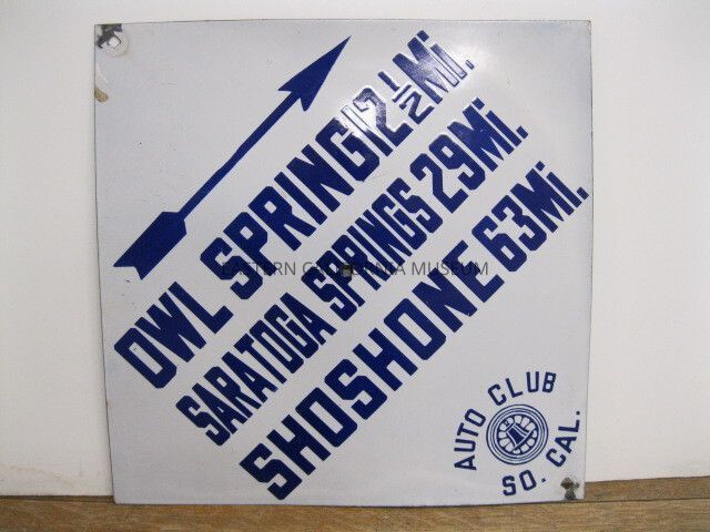 Diamond shaped Automobile Club of Southern California road sign, white with blue lettering, that says, "Owl Spring 12 1/2 Mi. / Saratoga Springs 29 Mi. / Shoshone 63 Mi."Collection