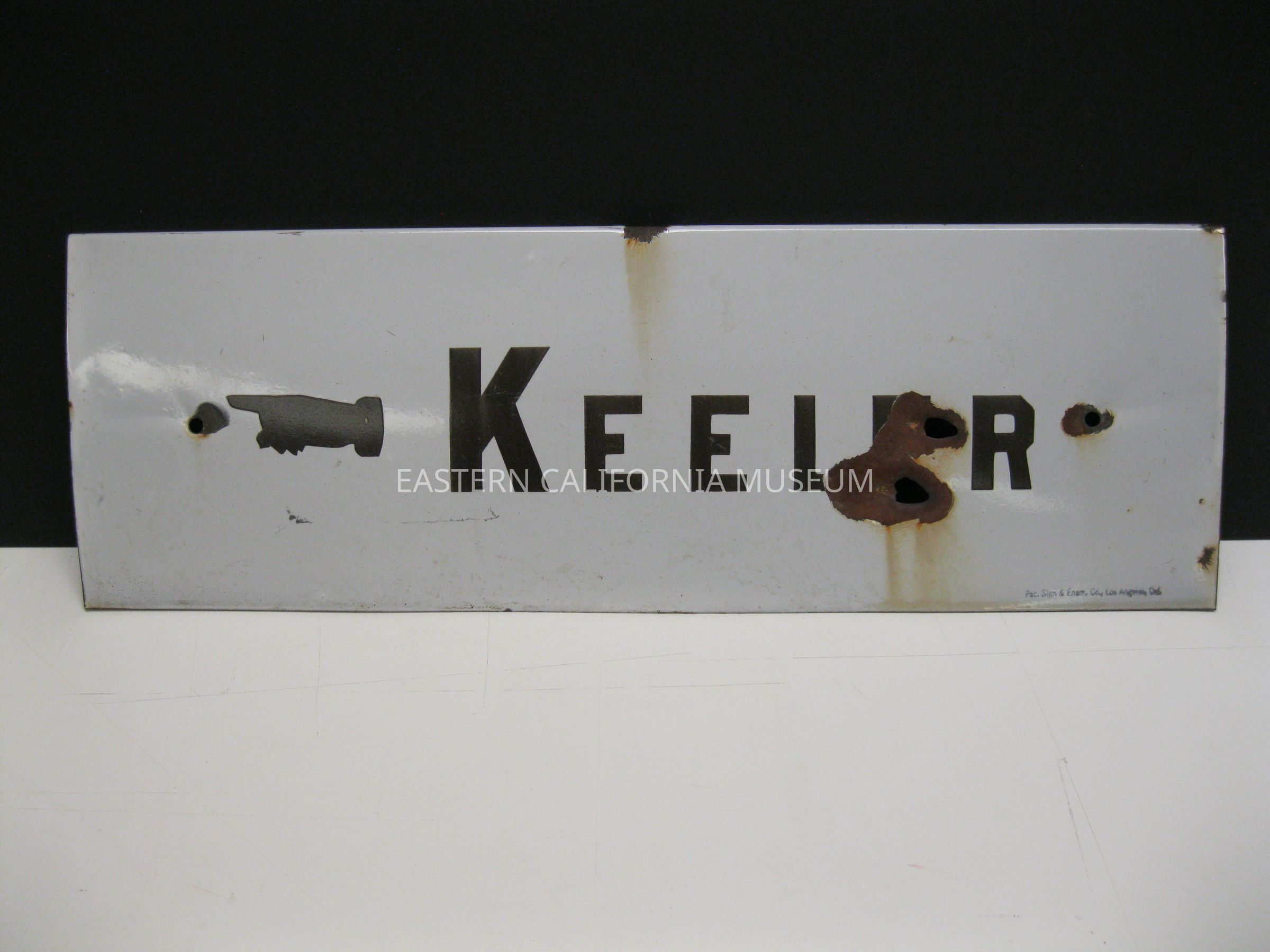 Rectangular sign, white with black lettering, that says, "Keeler." Stamped in lower right corner is, "Pac. Sign & Enam. Co., Los Angeles, Cal." Two large (bullet?) holes with surrounding rust.