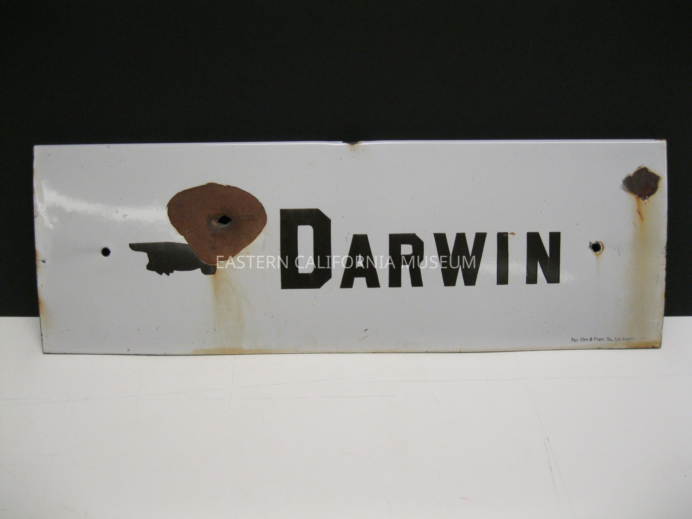 Rectangular sign, white with black lettering, that says, "Darwin." Stamped in lower right corner is, "Pac. Sign & Enam. Co., Los Angeles, Cal." One large (bullet?) hole with surrounding rust and another patch of rust, but no hole.