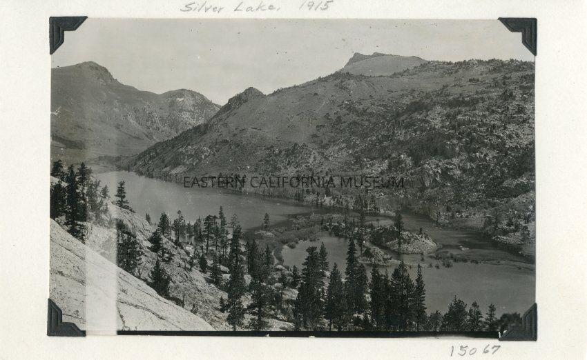 B&W glossy print: mounted on card stock with decorative corners, mountain lakes landscape