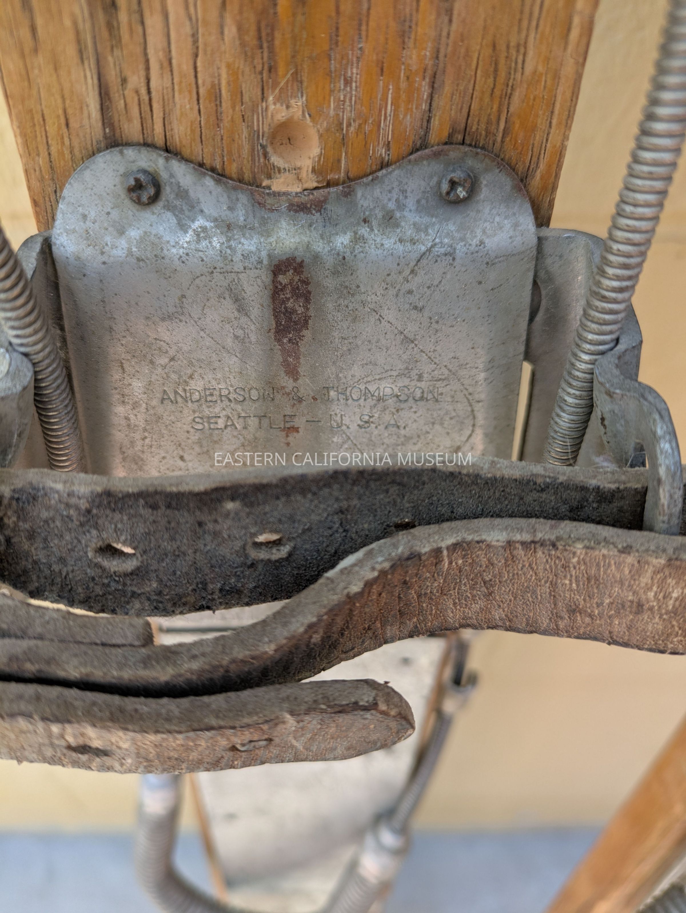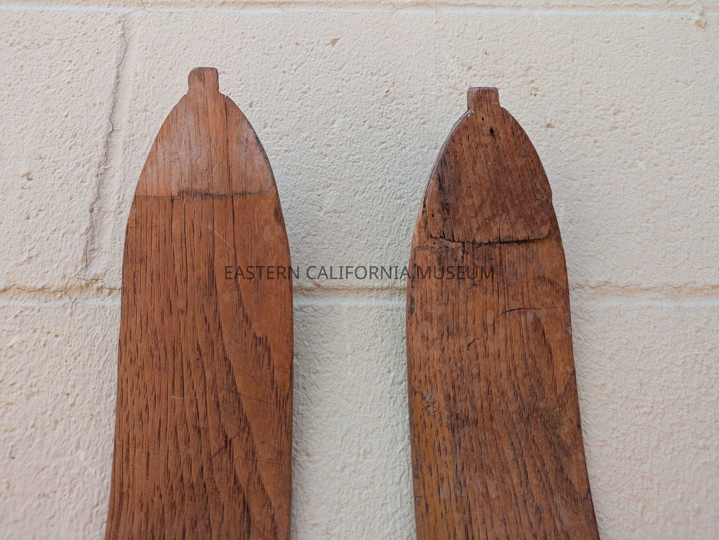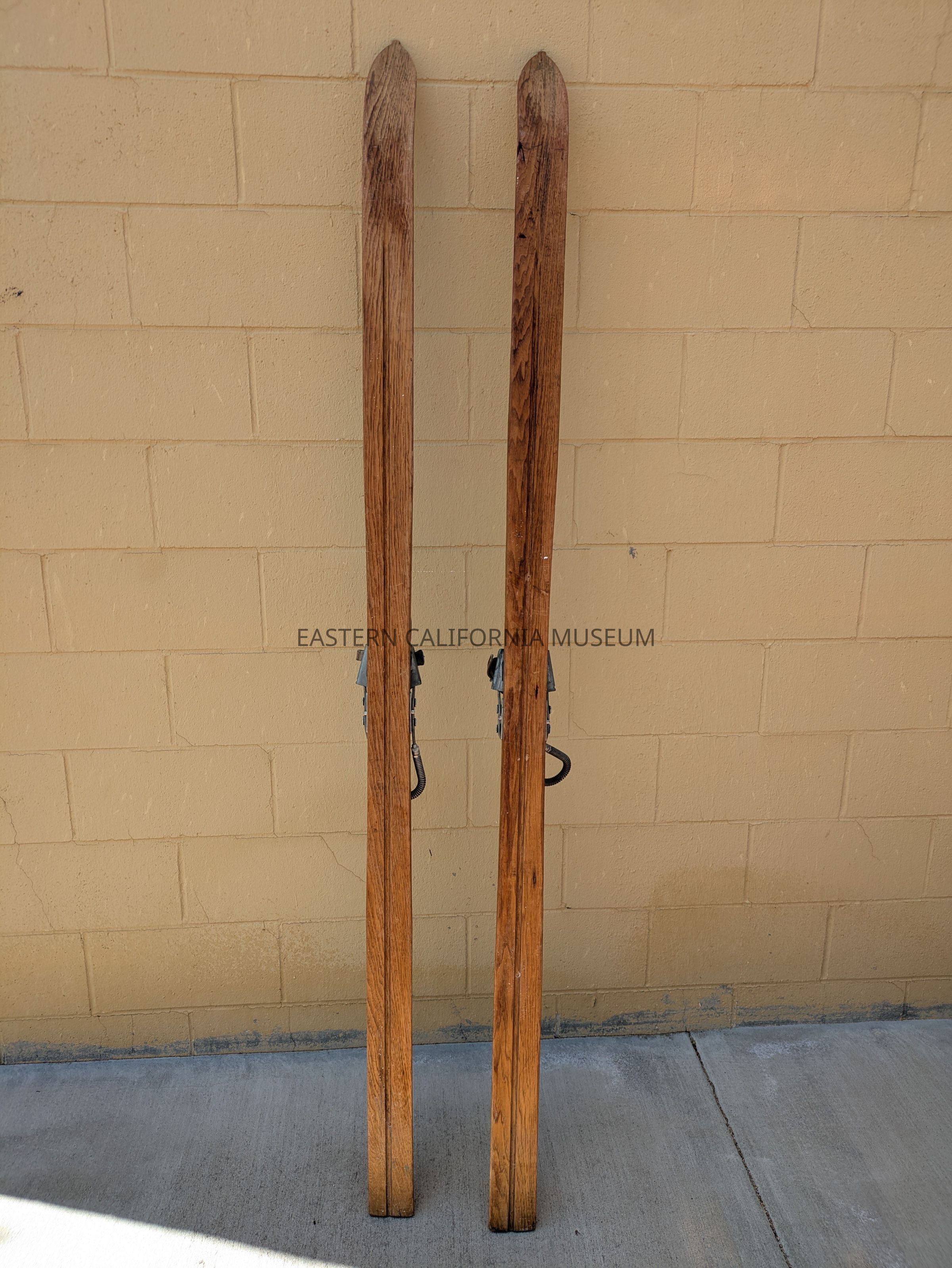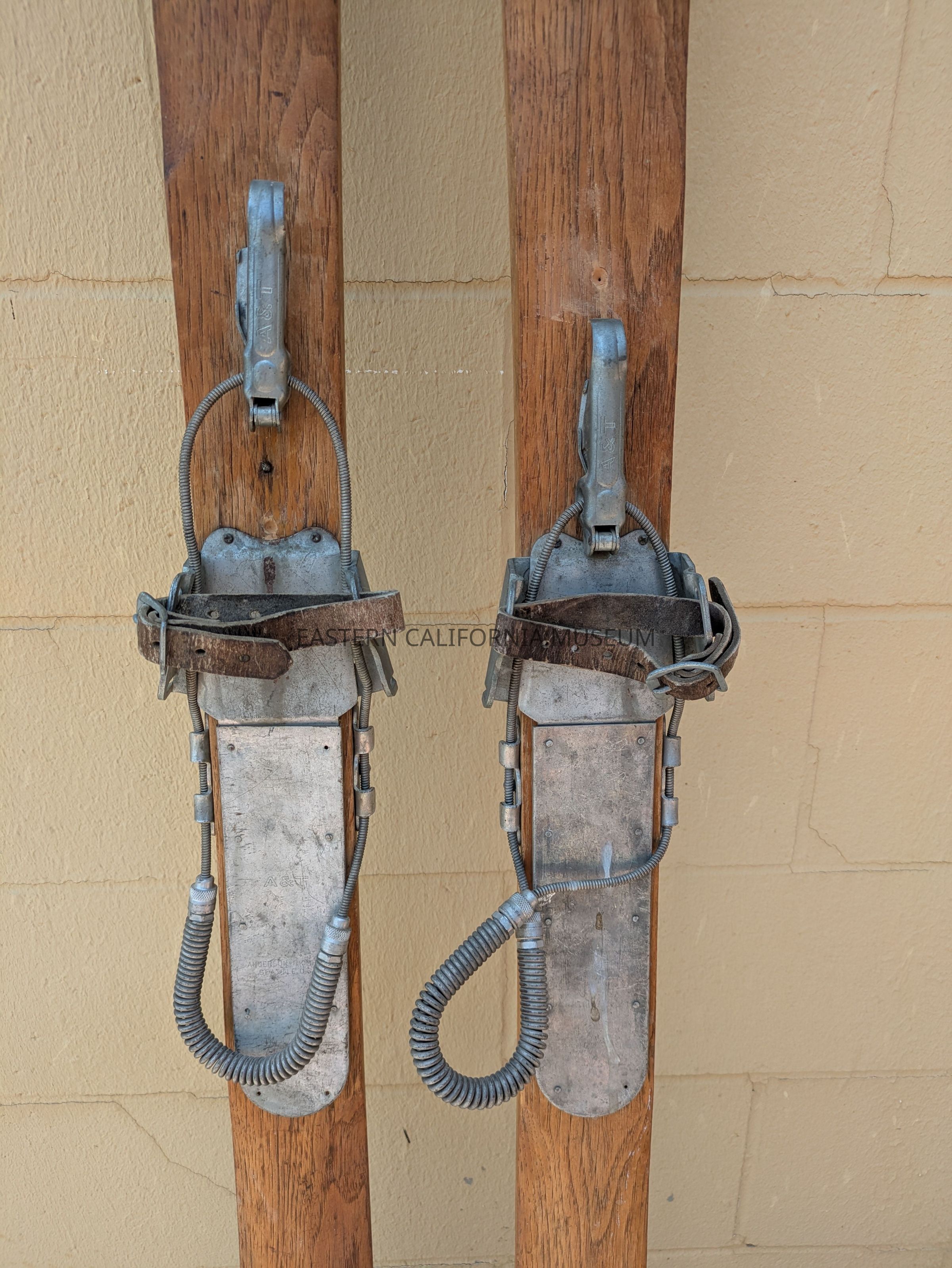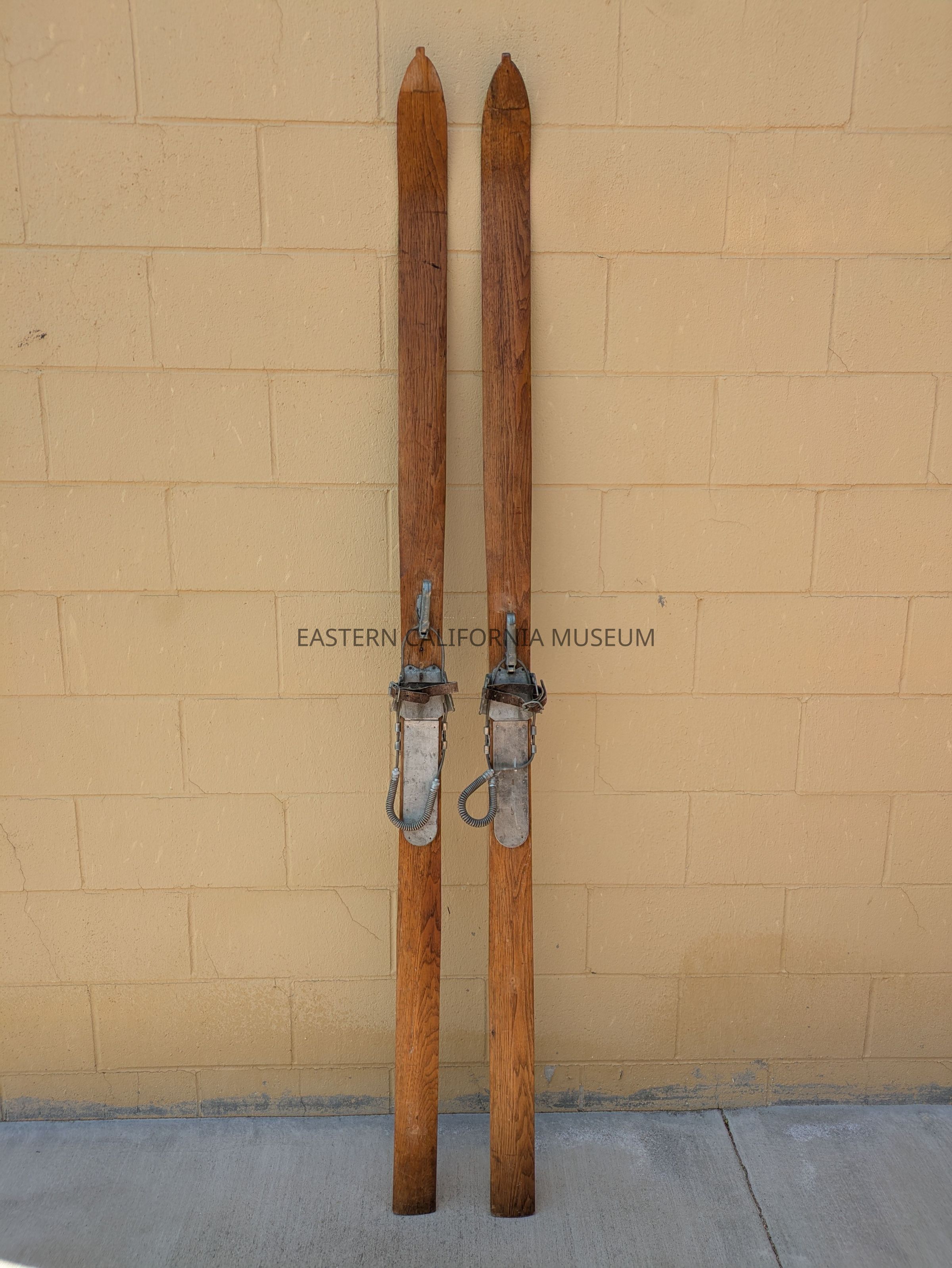 Pair of wood mountain/alpine skis that belonged to Norman Clyde. The bindings are Anderson & Thompson, Seattle, USA. Both skis had wooden caps on the tips, but one has since been lost.Collection