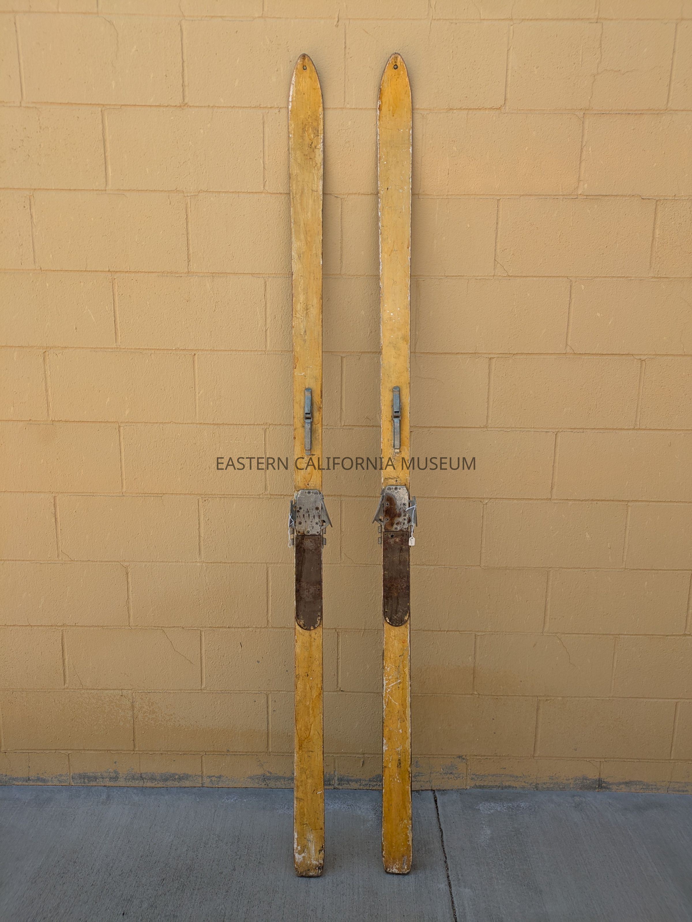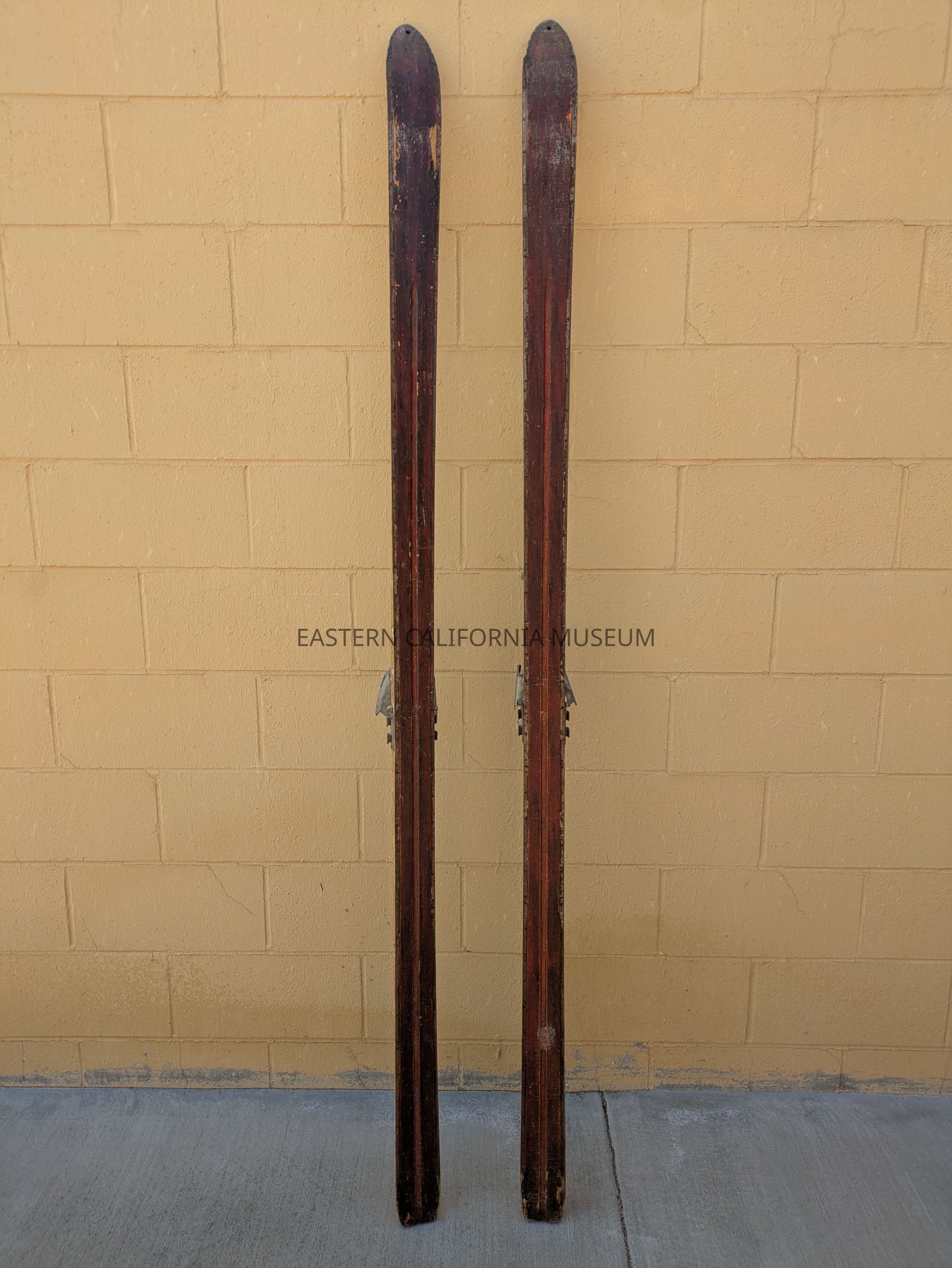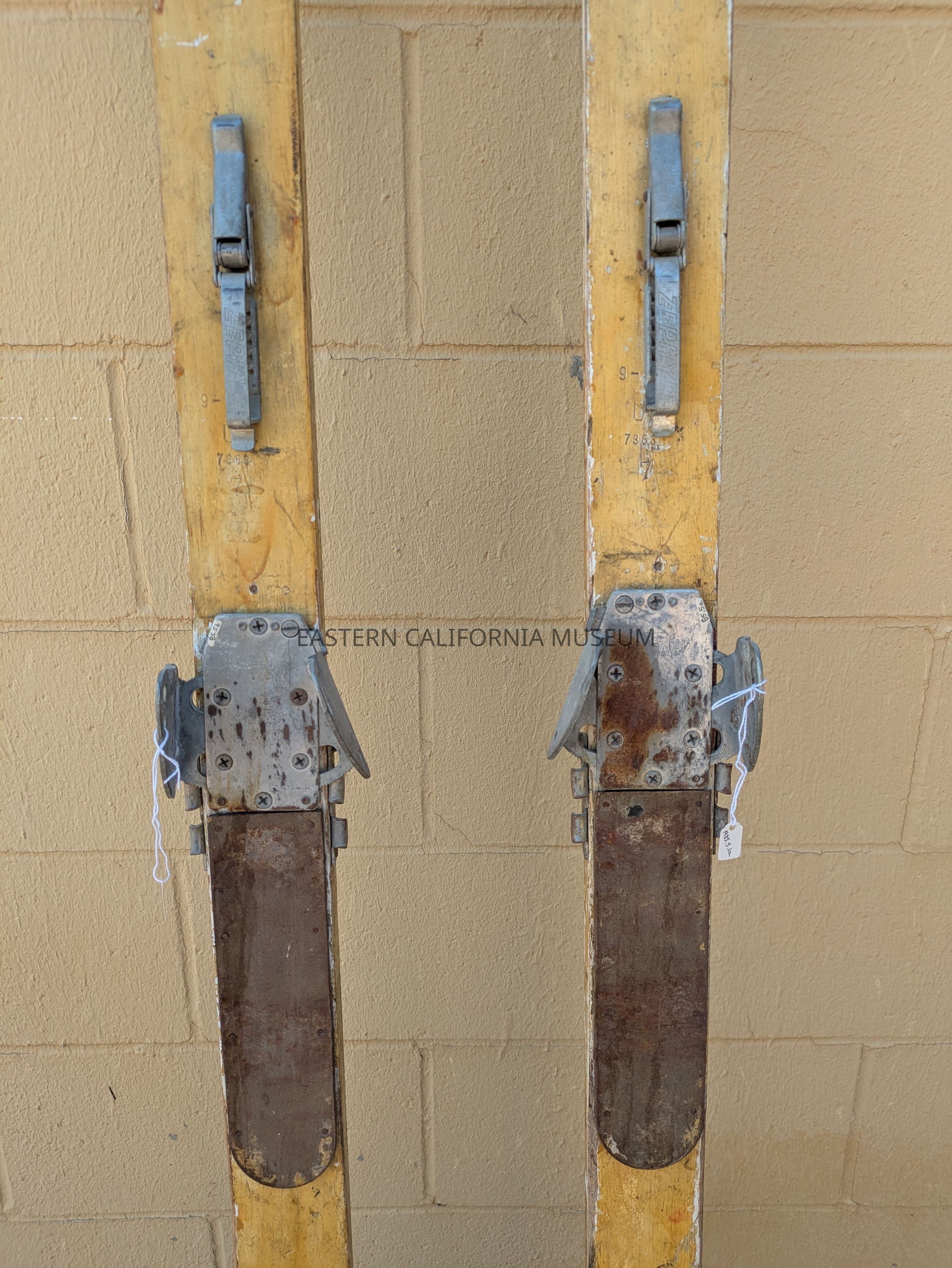 Pair of wood skis with metal edges. Bindings are "Zephyr" by Anderson & Thompson, Seattle, USA. Carved in the wood on each ski is, "I / 9-43 / US / 7-363 / 7." A visitor identified them as WWII military issue skis.