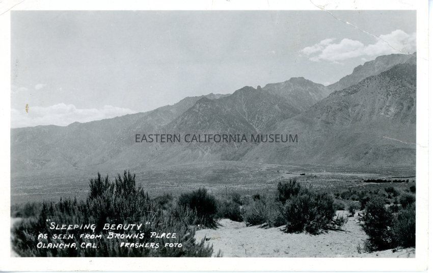 Photo postcard titled "Sleeping Beauty" as seen from Brown's Place, Olancha, Cal. Frashers Foto. Photo is of mountains and sagebrush.