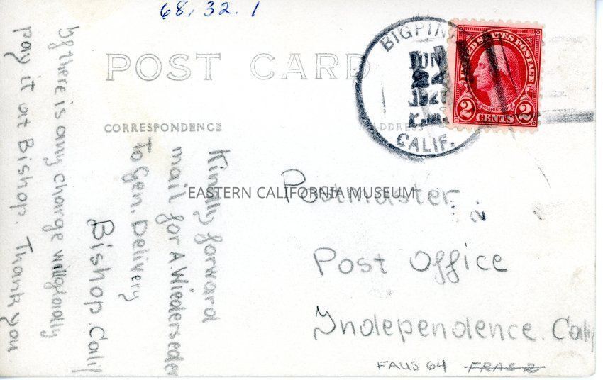 Reverse side has a 2 cent red George Washington stamp and cancellation mark dated June 24, 1928 in Big Pine, Cal. It is addressed to the Postmaster in Independence and says, "Kindly forward mail for A. Wiederseder to Gen. Delivery, Bishop, Calif. If there is any charge will gladly pay it at Bishop. Thank you."