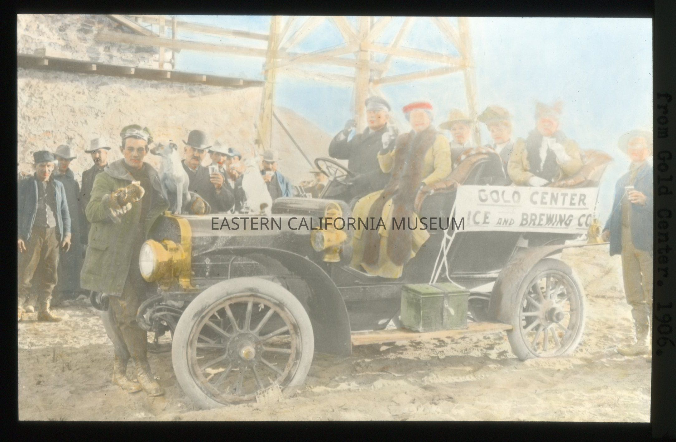 2023.0.73--#1324. Death Valley -- View of automobile from Gold Center. 1906. [Circle sticker #9] [Gold Center Ice and Brewing Co.]