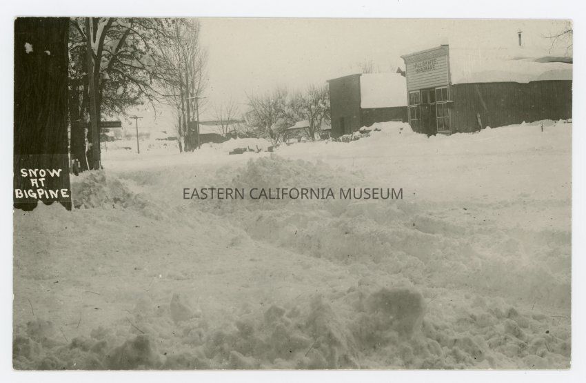 Photo postcard of a street scene covered in deep snow. The Hall and McAfee Hardware store is visibile on right while signs for "telephone" and "office" are visible to the left. The photo is titled, "Snow at Big Pine."