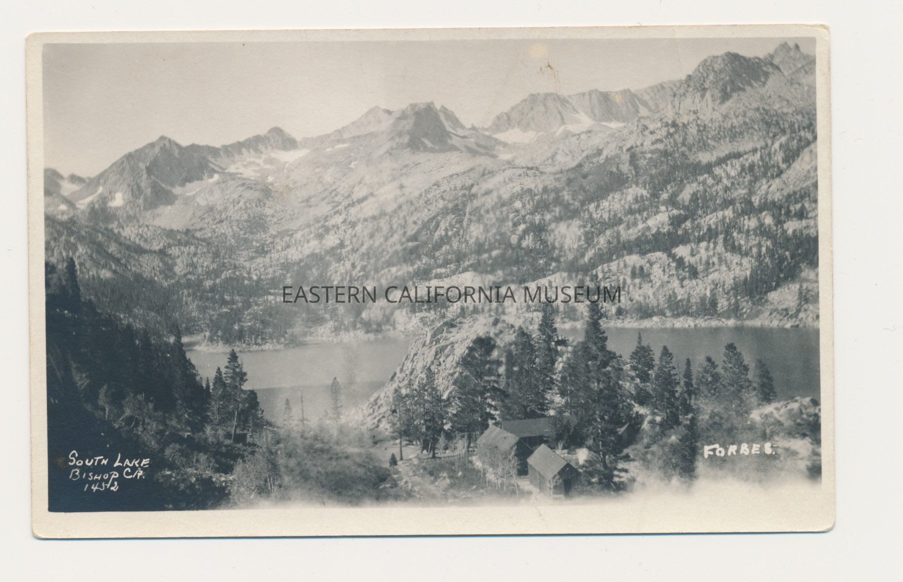 Photo postcard titled, "South Lake, Bishop, CA" taken by A. A. Forbes and given his ID #1452. There are several buildings in the lower foreground.Collection