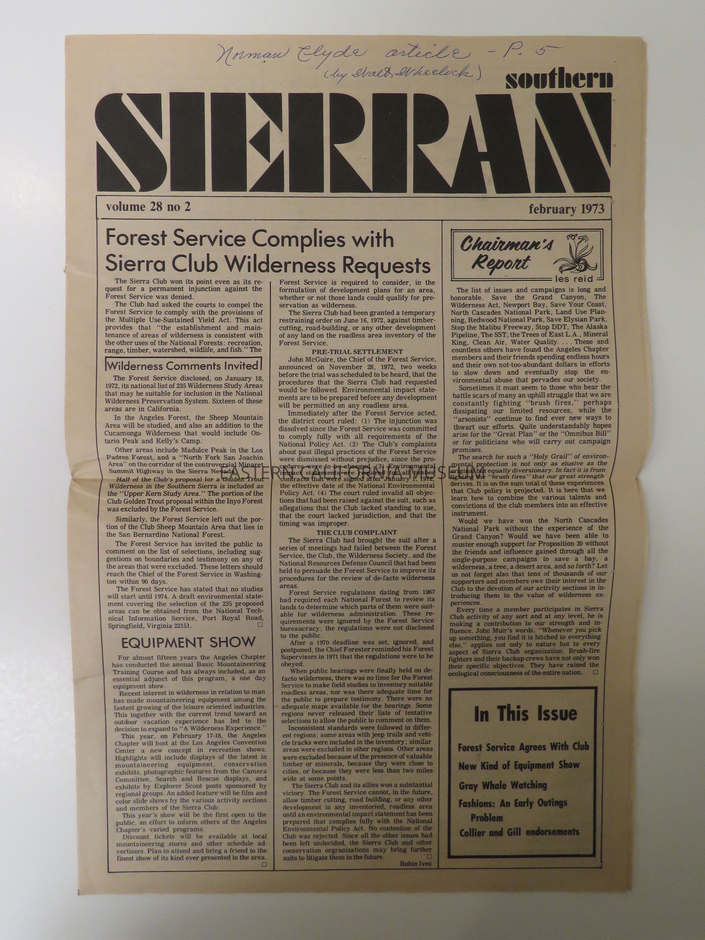 "Southern Sierran, Vol. 28, No. 2, February 1973" contains Norman Clyde's obituary. It is a monthly publication of the Angeles Chapter of the Sierra Club.Collection