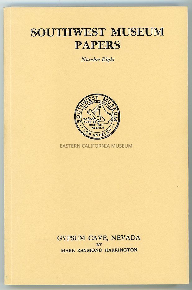 "Southwest Museum Papers, No. 8: Gypsum Cave, Nevada" was originally published in 1933 and has been reprinted. Stuffed inside book is a Los Angeles Times Sunday Magazine dated August 20, 1933 about Gypsum Cave.Publication Details