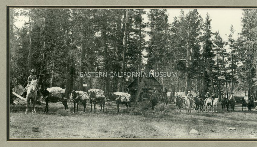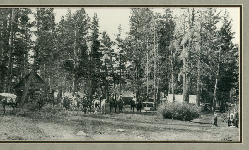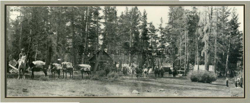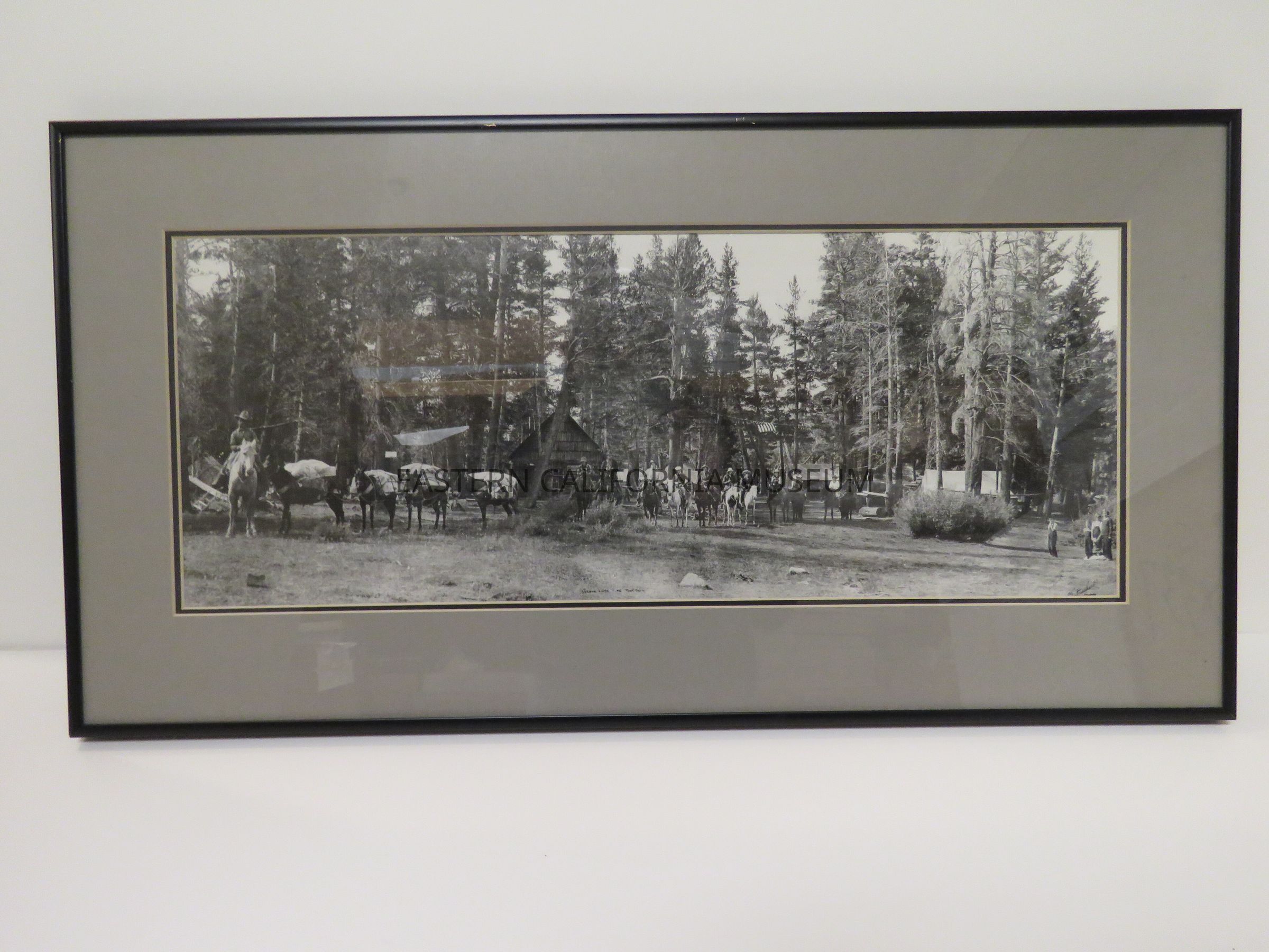 Framed panorama photo titled, "Spears Lone Pine Pack Train." It shows a large pack train and riders in the forest with a cabin and tents in the background. A U.S. flag is hanging from a rope between the trees. Photo by Burton Frasher, circa 1928.