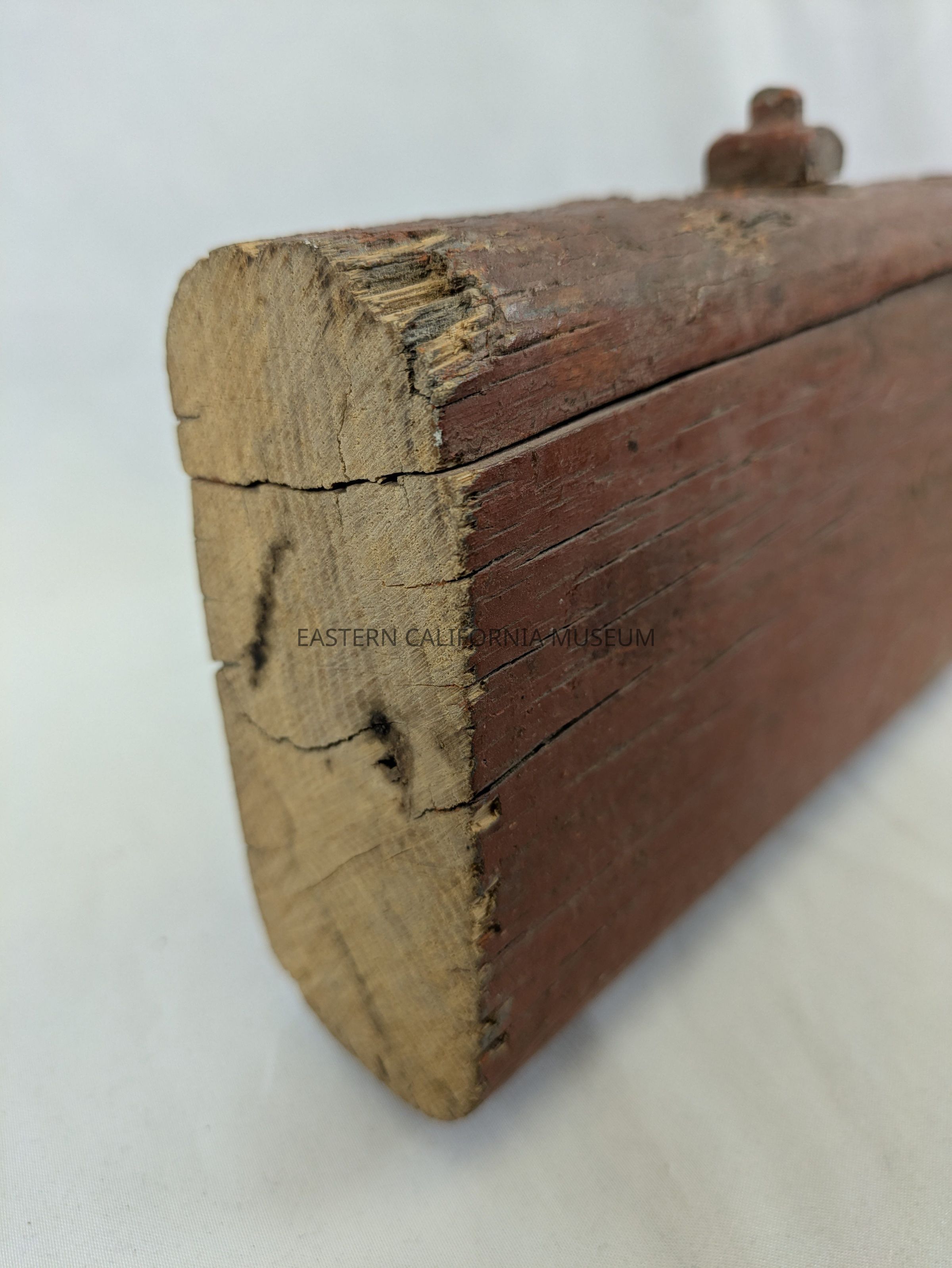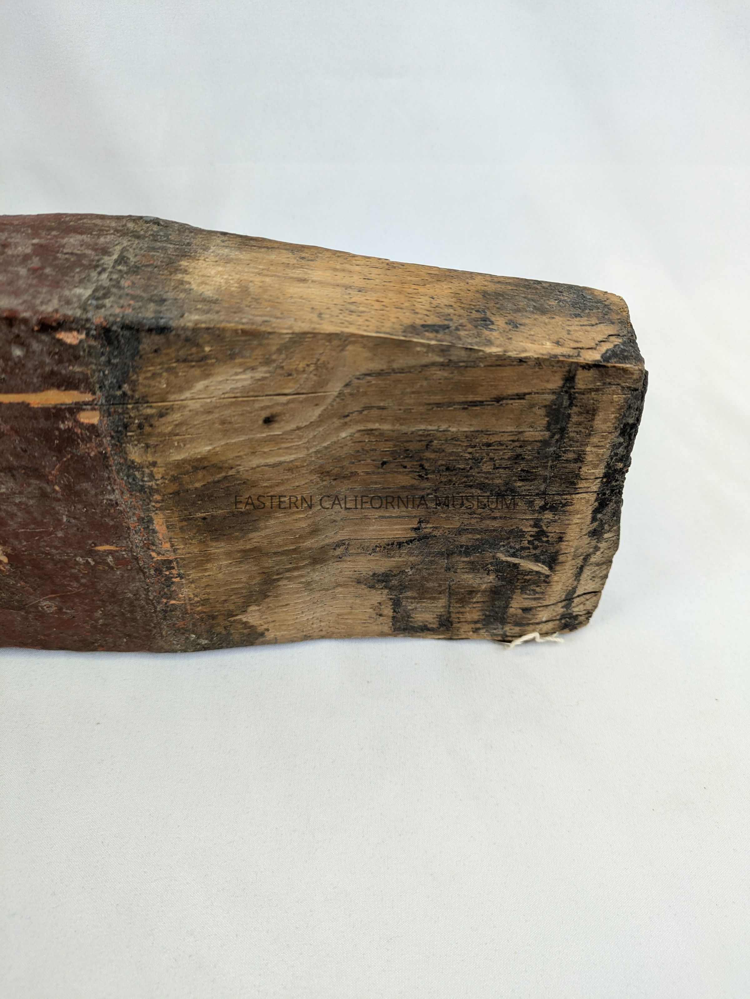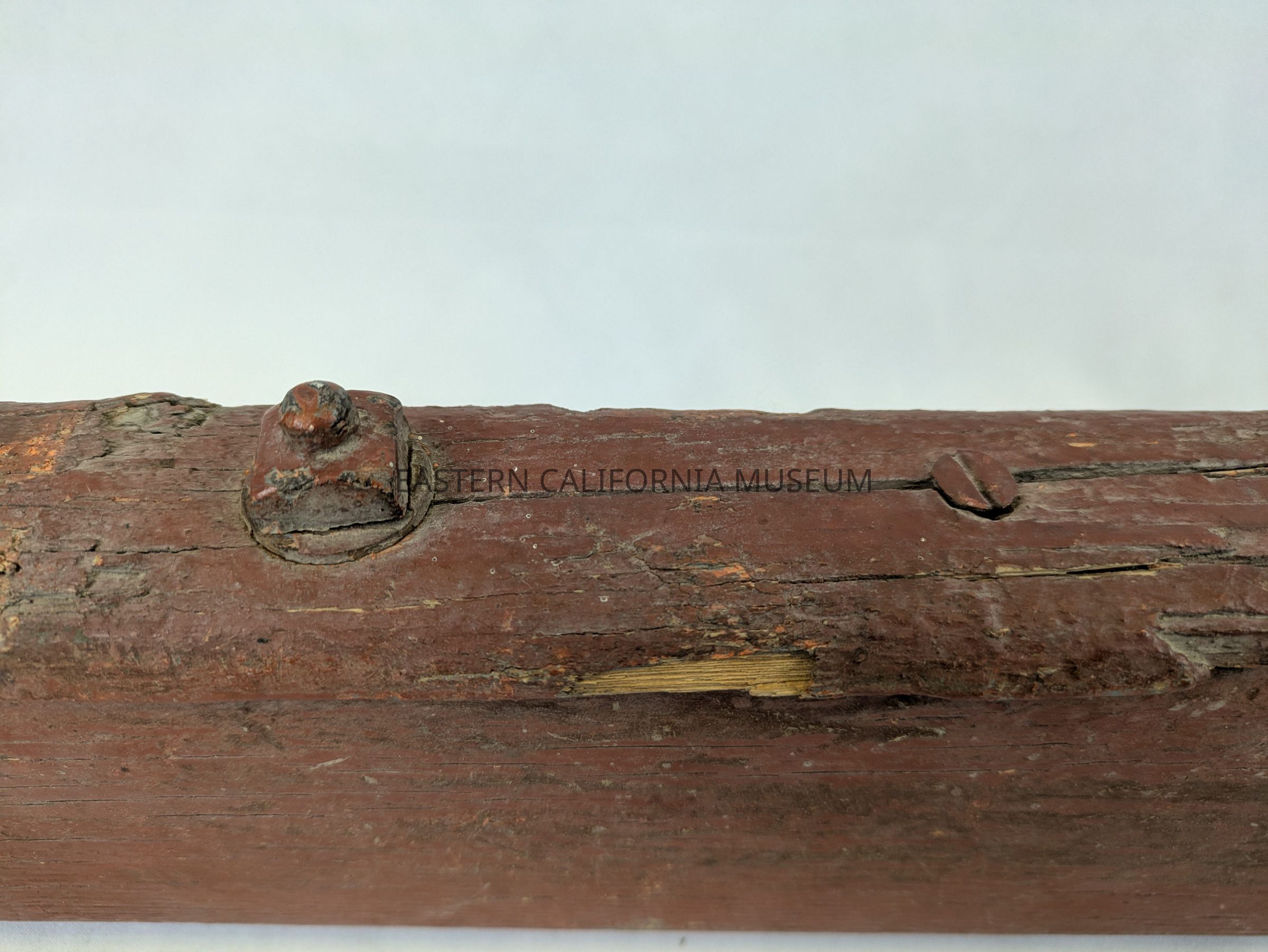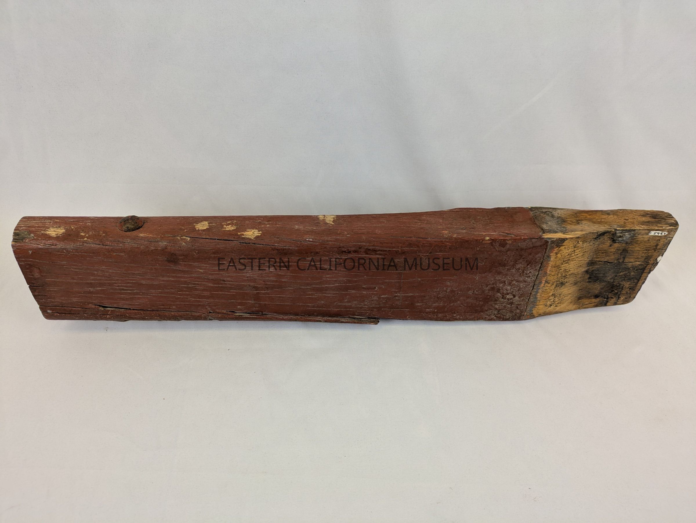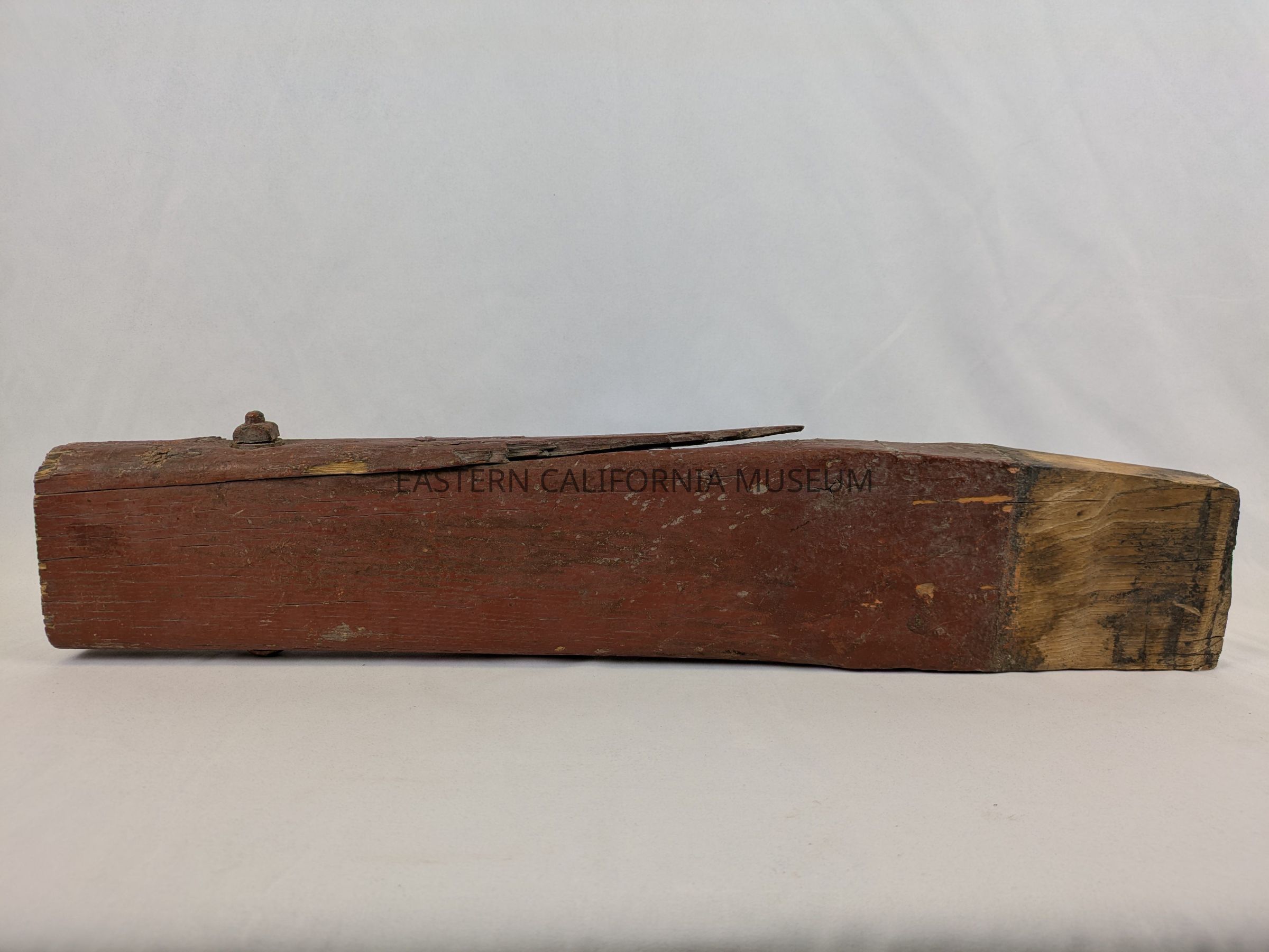 This item has been identified by Ed Hartshorn as part of a spoke from the wheel of the original Twenty Mule Team Borax wagon. It is wood painted red. It tapers at one end, unpainted, where it would fit into either the hub or rim of the wheel. There is a metal bolt, washer, and nut near the opposite end, possibly holding a splinter/fragment of wood together. This end has been sawed off cleanly.Collection