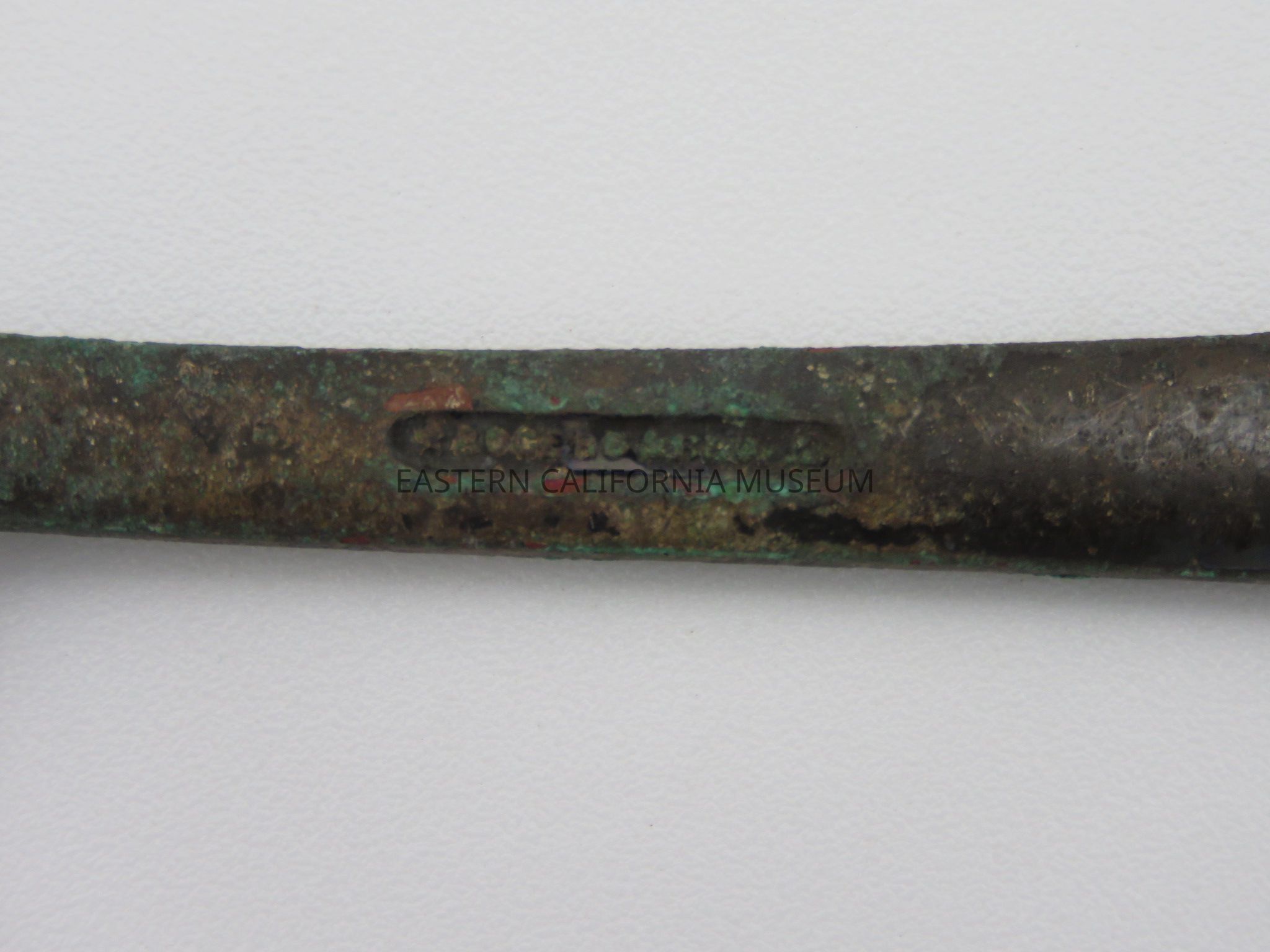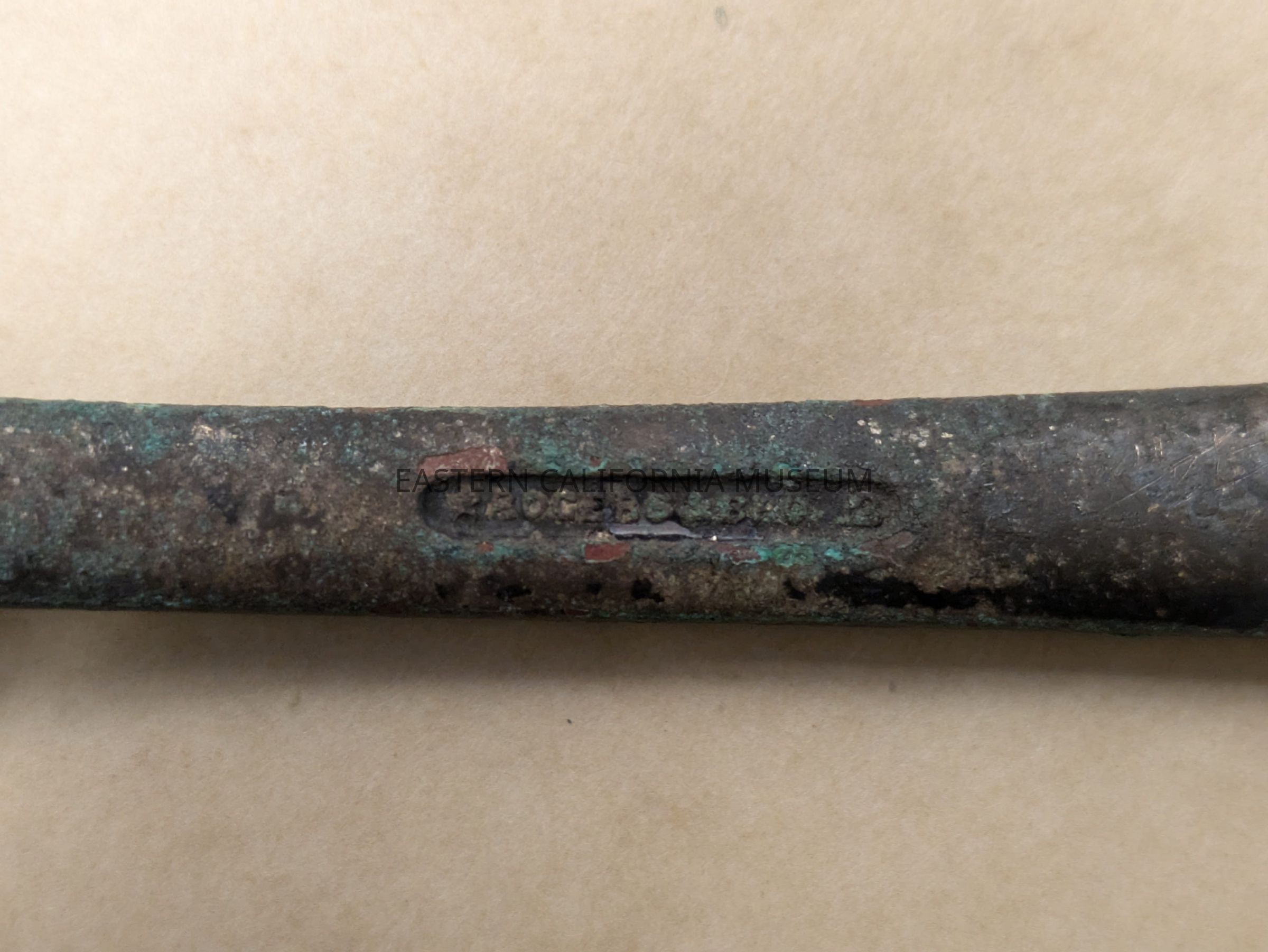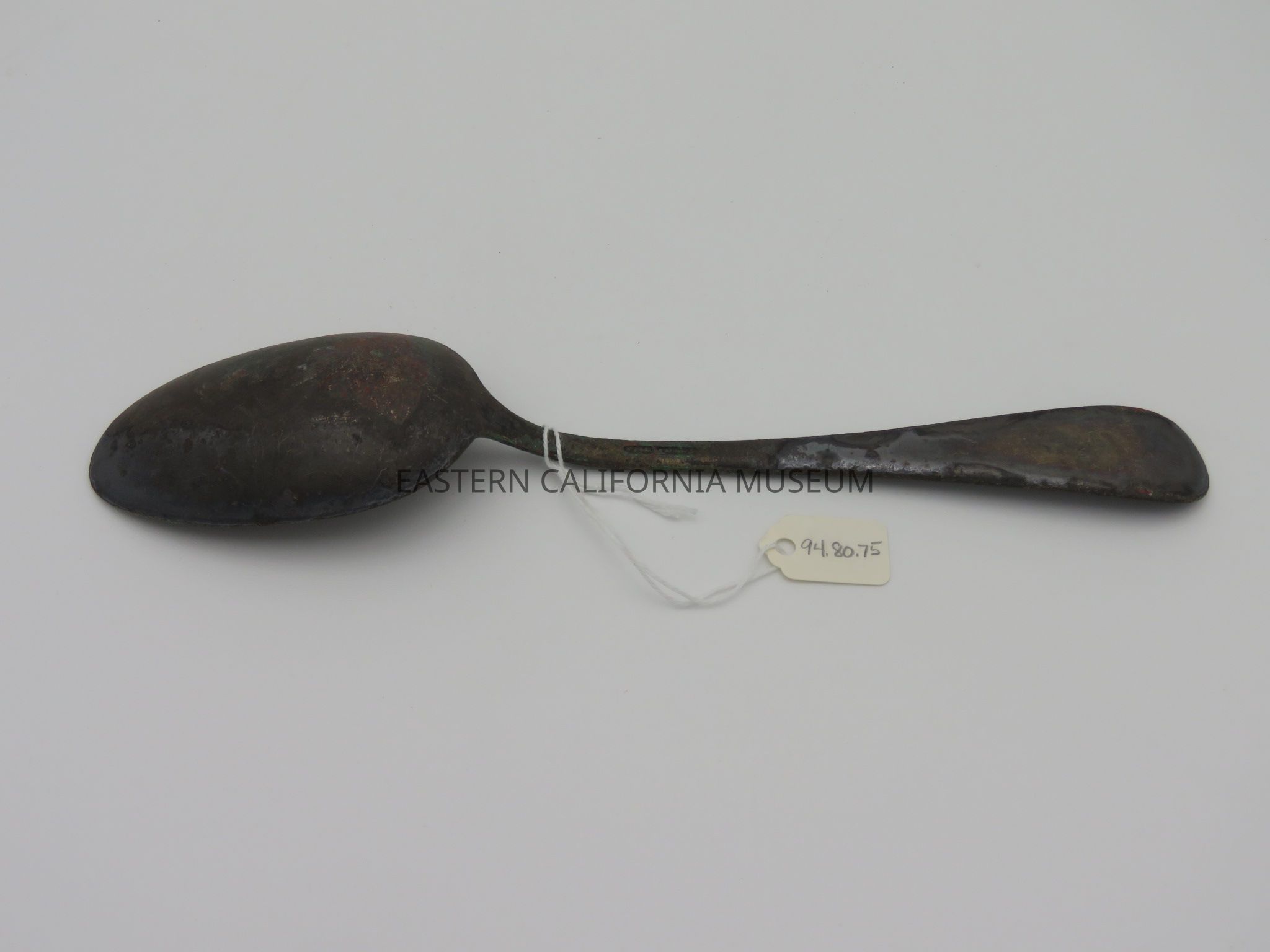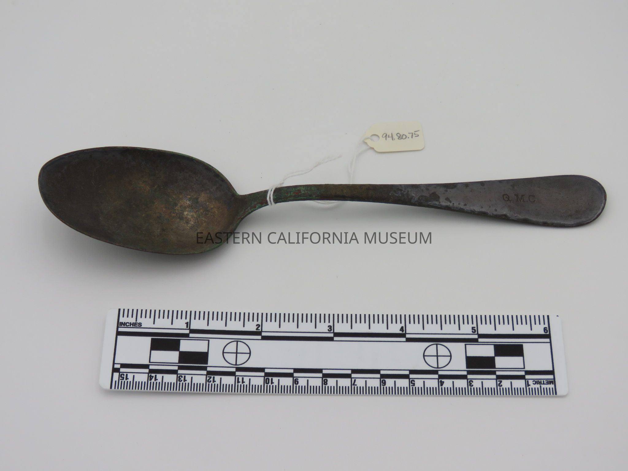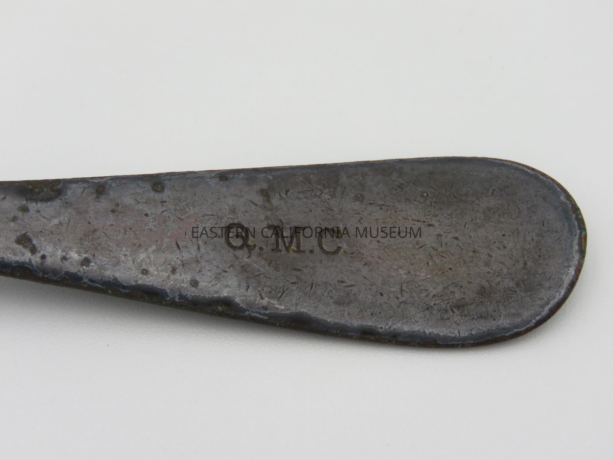 Spoon with "Q.M.C." on the handle and what looks like "Rogers & [illegible, maybe Son or Bros?] 2" on the back. It was likely used at Manzanar War Relocation Center.Collection