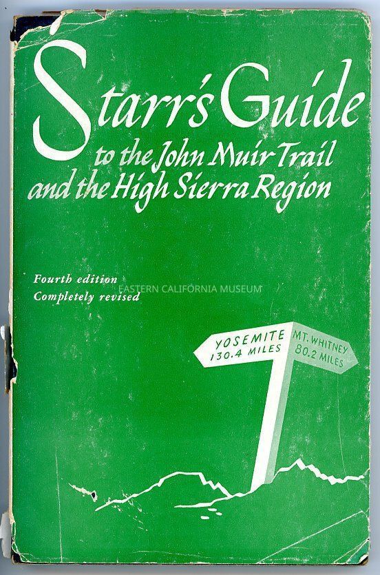 "Starr's Guide to the John Muir Trail and the High Sierra Region" has a damaged dustjacket. It is inscribed "Alan Rowe, June 1953." Contains 1 of 1 maps in back pocket (2013.10.13b).Collection