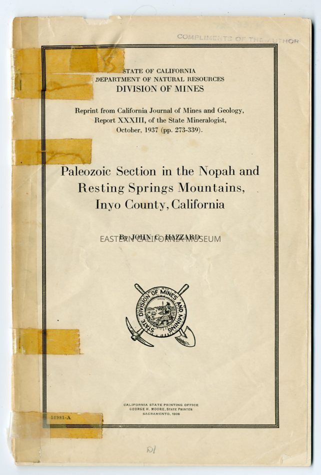 "State of California, Department of Natural Resources, Division of Mines: Paleozoic Section in Nopah and Resting Springs Mountains, Inyo County, California" is reprinted. The cover is taped together.Publication Details