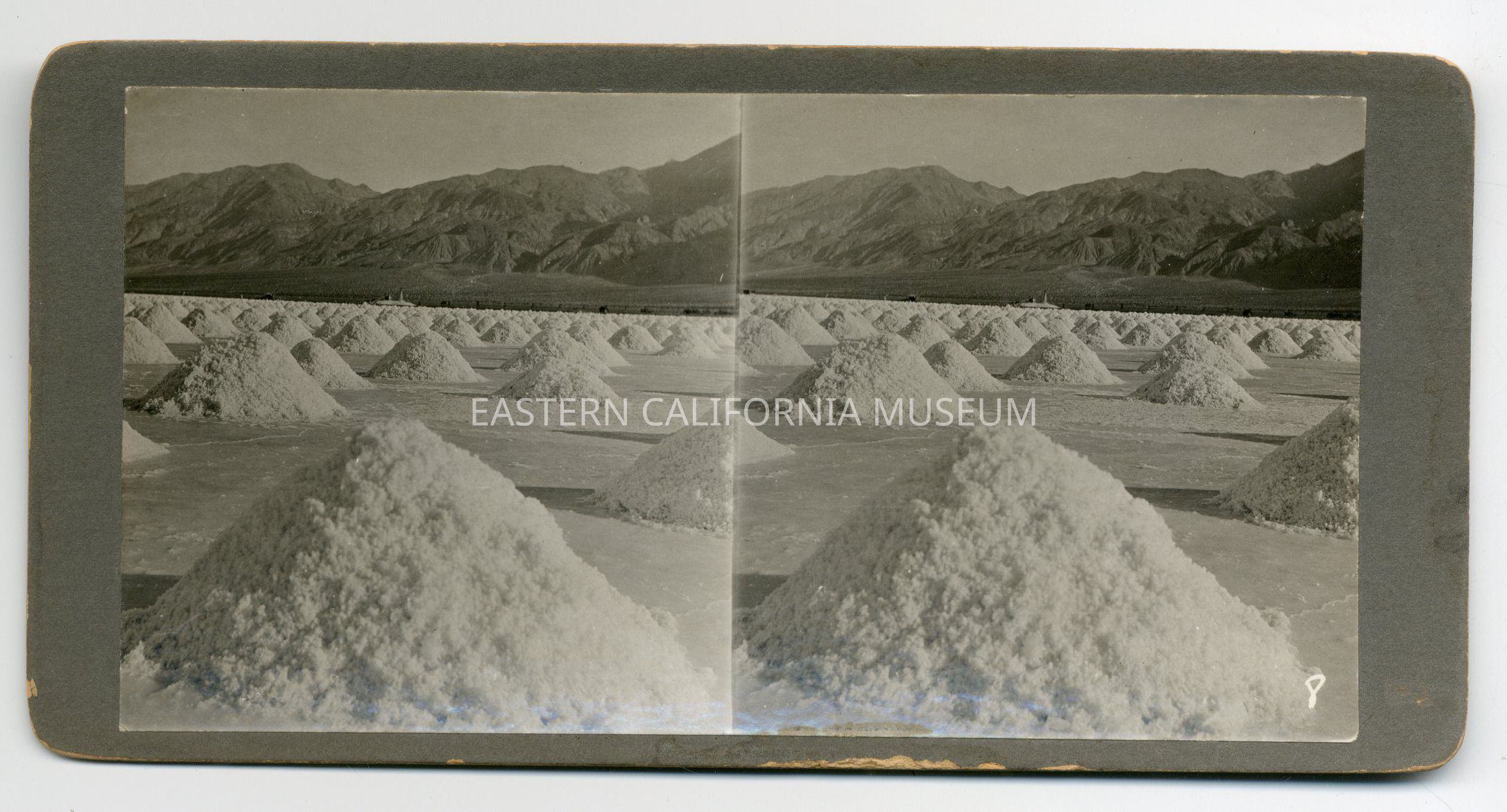 Stereograph of salt piles in Saline Valley salt lake. Photo taken looking south towards tram. The salt piles are approximately 3 feet high and 400 to 500 pounds each. Photographed by Pacific Art Co. of Los Angeles and given their ID #8.Collection