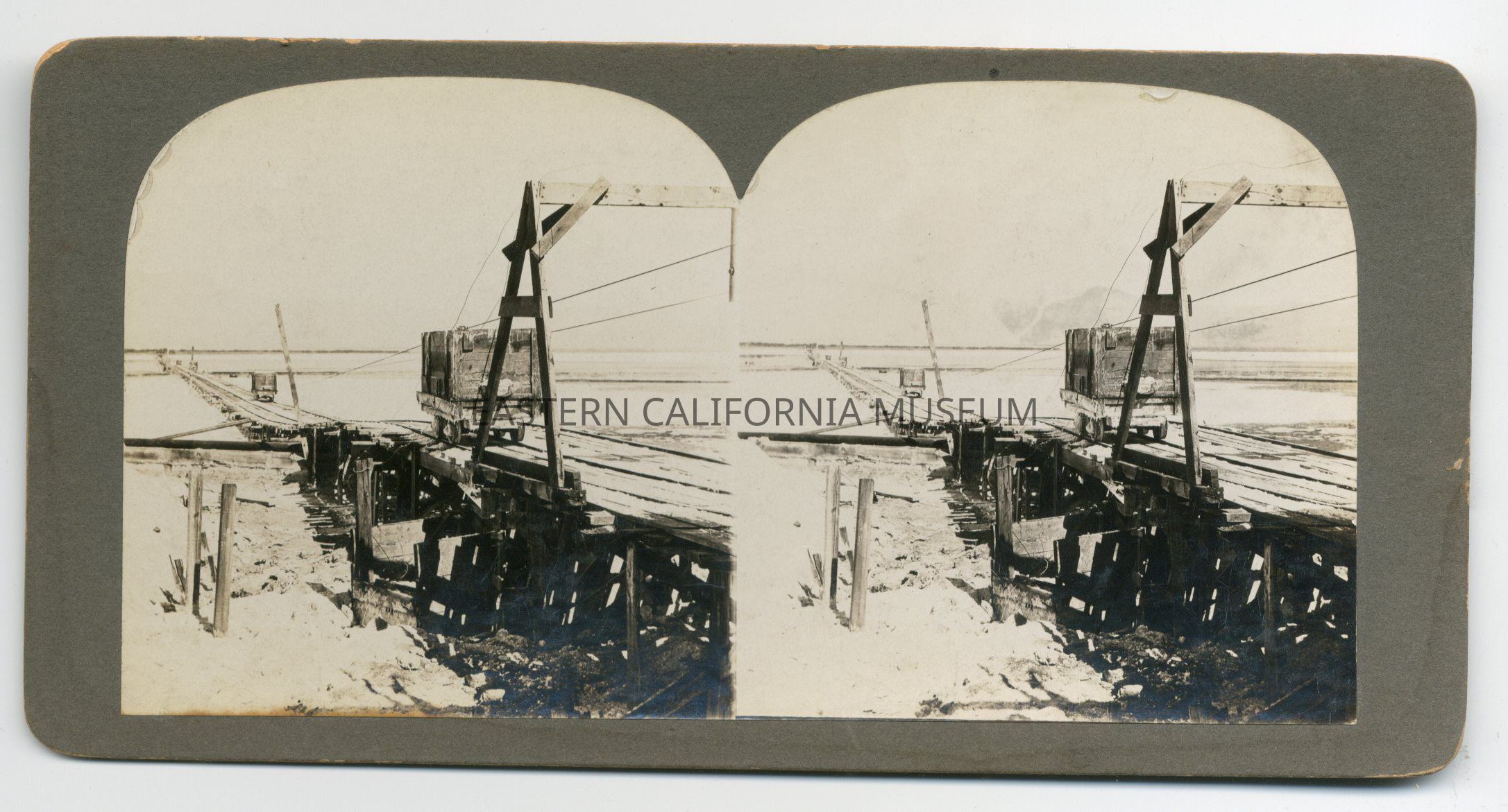 Stereograph of a cart on a track on top of a wooden platform. It is a dual track wooden transfer for salt cars on salt lake near the tram loading terminal. These prints are arched at the top, instead of being square. Photographed by Pacific Art Co. of Los Angeles.Collection