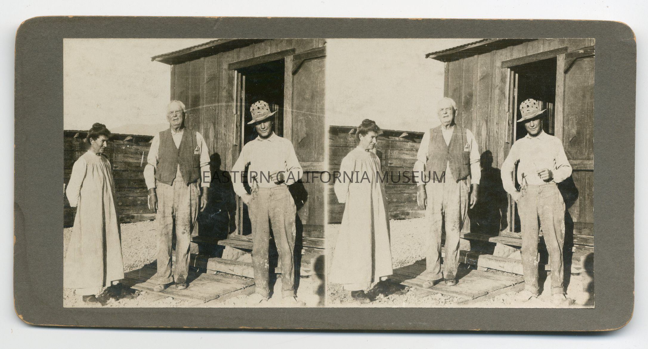 Stereograph of three people standing in front of a wooden structure. It is a camp for employees working in the Saline Valley salt fields. The man in middle is White Smith, the President of the Saline Valley Salt Co. Photographed by Pacific Art Co. of Los Angeles.Collection