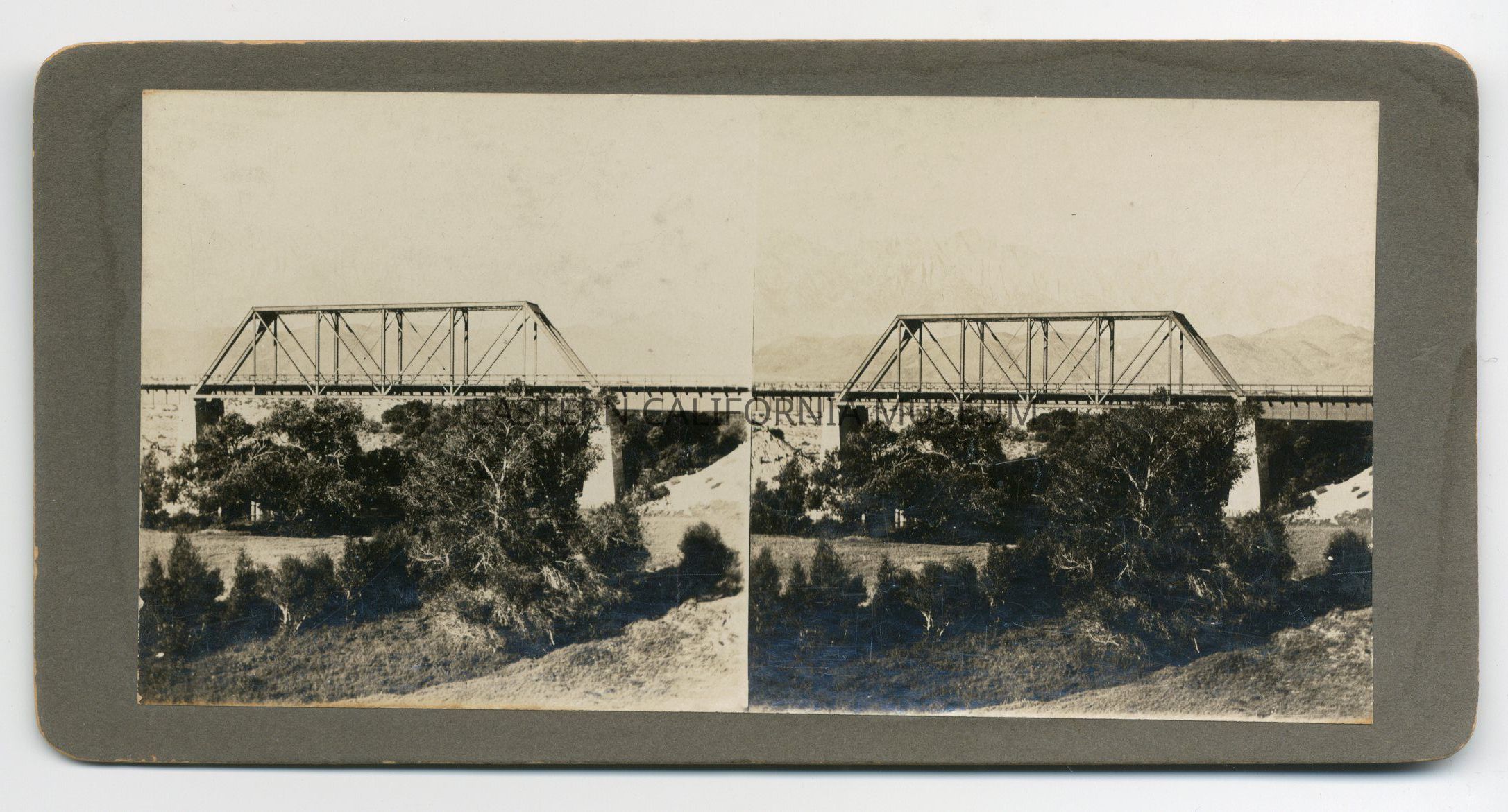 Stereograph of the Southern Pacific standard gauge railroad bridge north of Lone Pine Station. Photographed by Pacific Art Co. of Los Angeles.