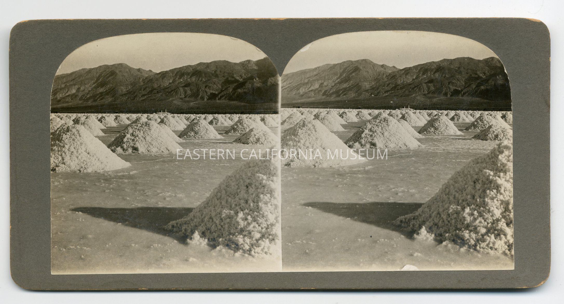 Stereograph of salt piles in Saline Valley salt lake. Photo taken looking south towards tram. The salt piles are approximately 3 feet high and 400 to 500 pounds each. These prints are arched at the top, instead of being square. Photographed by Pacific Art Co. of Los Angeles.Collection