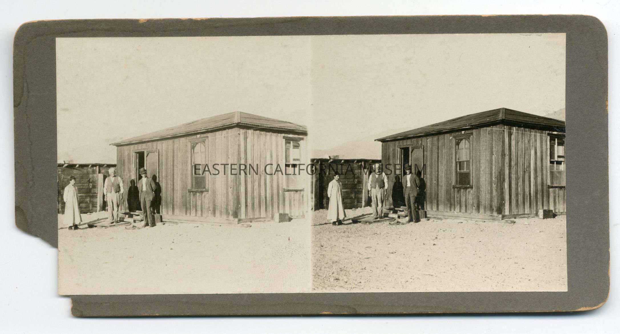 Stereograph of three people standing in front of a wooden house in the desert. It is a camp for employees working in the Saline Valley salt fields. The man in middle is White Smith, the President of the Saline Valley Salt Co.