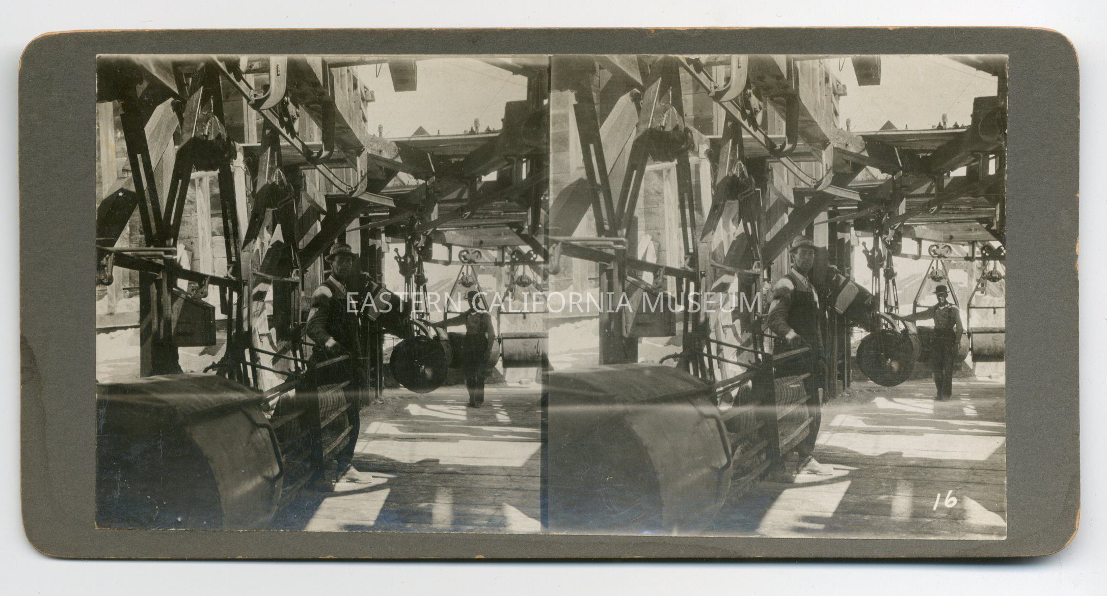 Stereograph of two men in the station #1 loading terminal at salt field. Notice the special buckets with mattresses for people to ride in. Photographed by Pacific Art Co. and given their ID #16.Collection