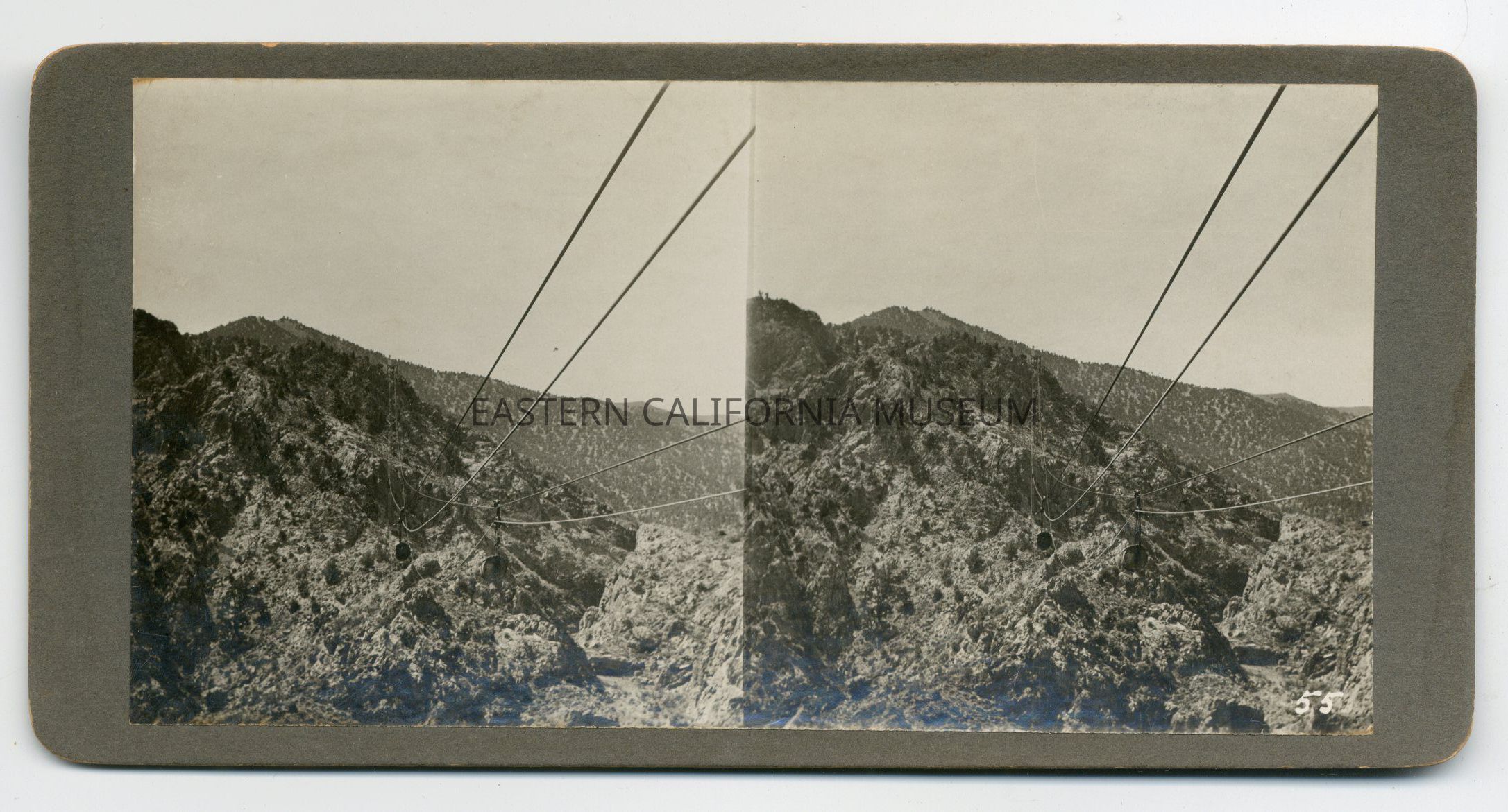 Stereograph tram cables and buckets in Daisy Canyon looking west, between control station #2 (station #15) and station #16. Photographed by Pacific Art Co. of Los Angeles and given their ID #55.Collection