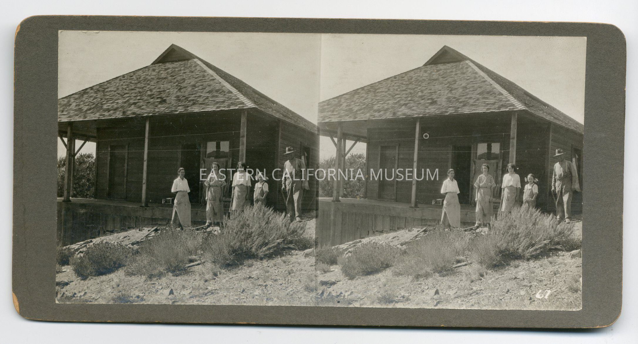 Stereograph of a group of five people standing outside of the caretaker/operator house next to summit station. Photographed by Pacific Art Co. of Los Angeles and given their ID #61.Collection