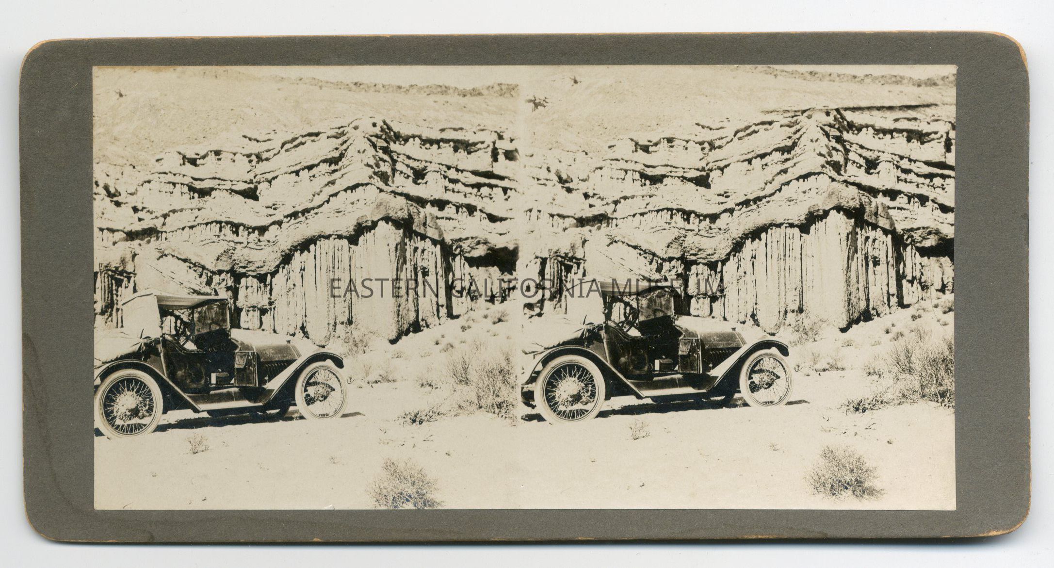 Stereograph of an early automobile parked in Red Rock Canyon. Photographer was Pacific Art Co. of Los Angeles.