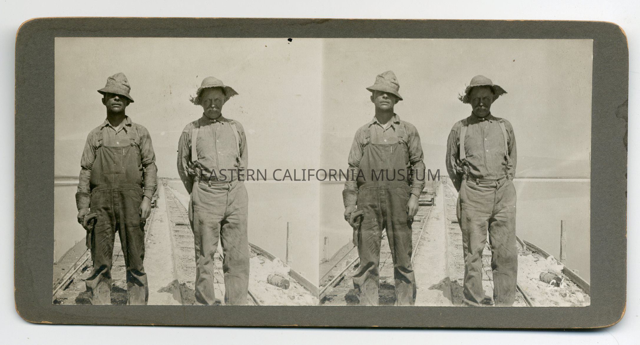 Stereograph of Arthur Diaz of Lone Pine (on left) and Ned Smith (on right) standing on tracks used to move the wooden salt cars in Saline Valley. The carts were moved via cable.