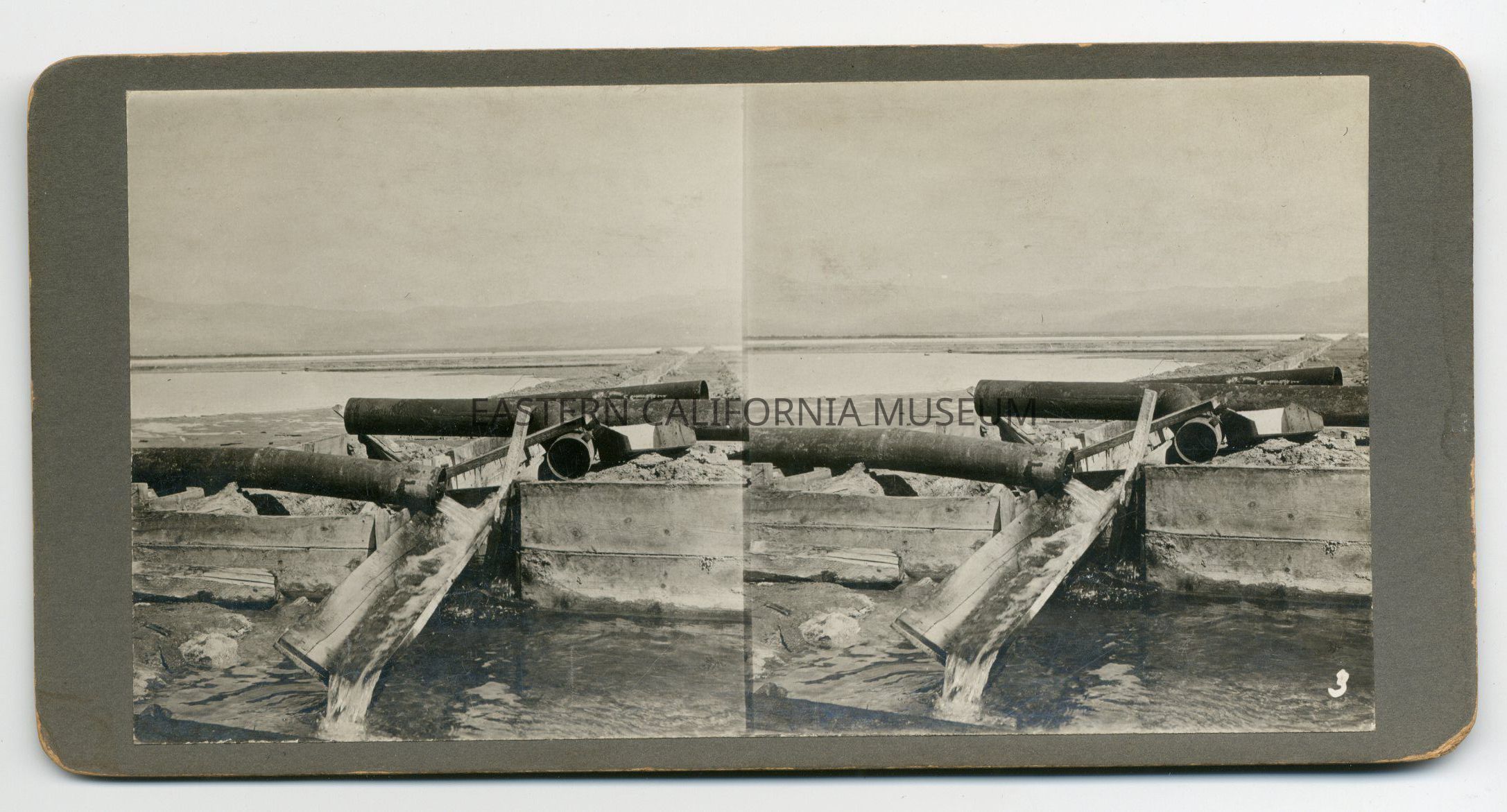 Stereograph of pipes and flumes on the Saline Valley salt lake. Photo taken looking east. Water from Hunter Canyon was used in the evaporation process of harvesting salt. Photographed by Pacific Art Co. of Los Angeles and given their ID #3.Collection