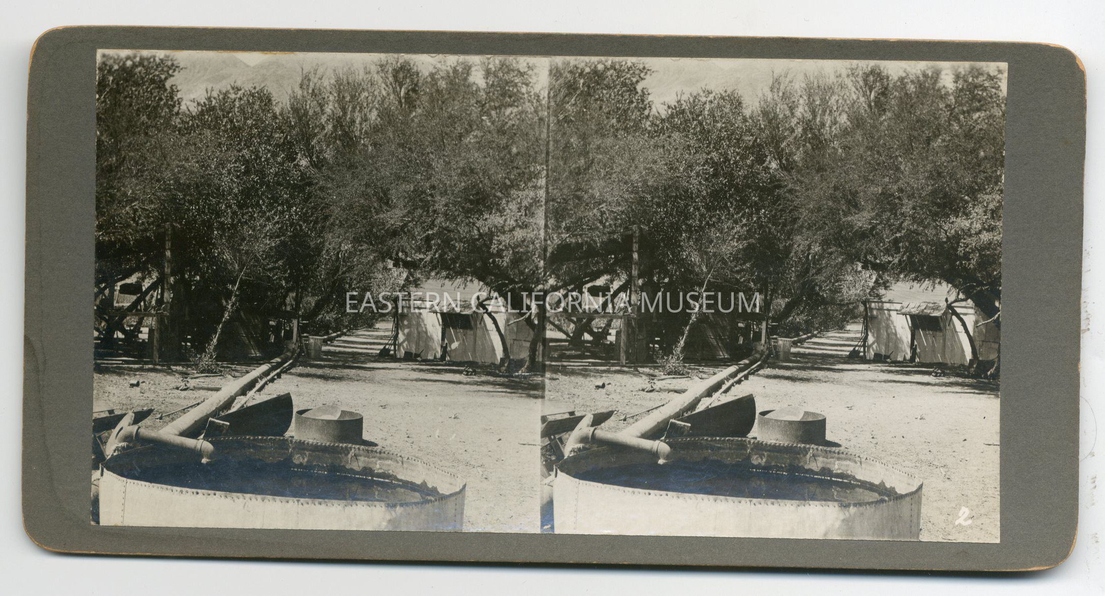 Stereograph of a camp for employees working in the Saline Valley salt fields. There is a large, round, metal tub in the foreground with a pipe/faucet. The water came from from Hunter Canyon. Photographed by Pacific Art Co. of Los Angeles and given their ID #2.Collection