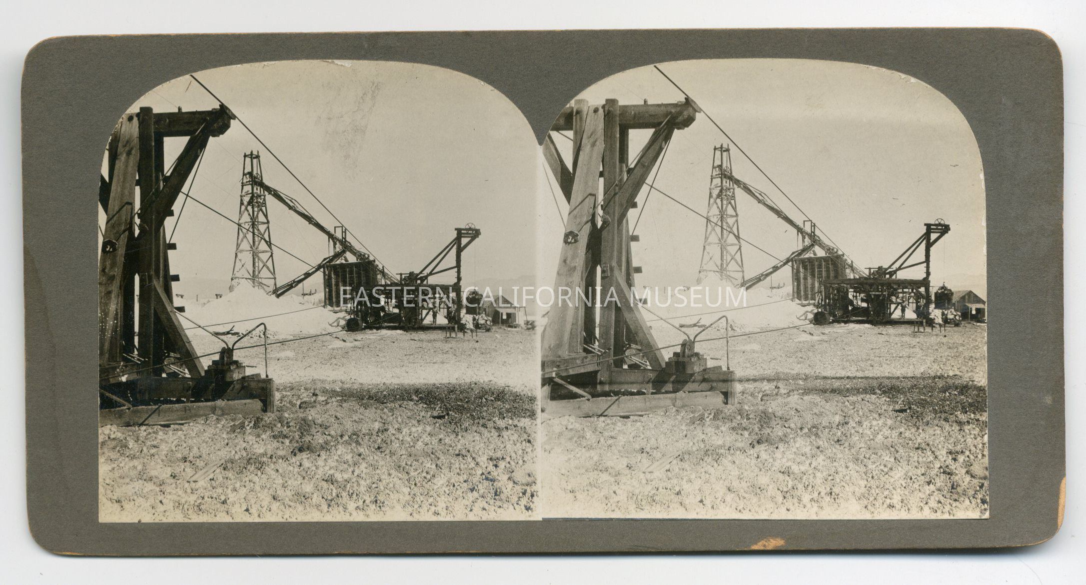 Stereograph of station #1 loading terminal. The tower on the left is the first intermediate tower still standing (as of 1991). Note the counter weight box containing approximately 3 tons of rock hanging on right side of terminal. These prints are arched at the top, instead of being square. Photographed by Pacific Art Co. of Los Angeles.Collection